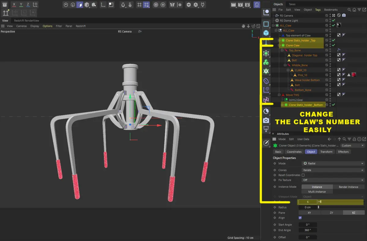 3D Model of Metal Claw 17 with RiggingThe animation for the claw is set up using a rig, allowing you to control it easily. You only need to move the highlighted element on the screen, and all other parts will move automatically in response to rigging.
