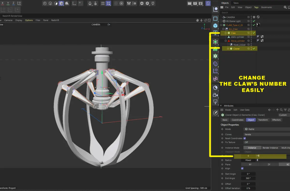 3D Model of Metal Claw 20 with RiggingThe animation for the claw is set up using a rig, allowing you to control it easily. You only need to move the highlighted element on the screen, and all other parts will move automatically in response to rigging.