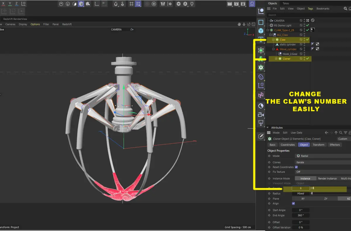 3D Model of Metal Claw 29 with RiggingThe animation for the claw is set up using a rig, allowing you to control it easily. You only need to move the highlighted element on the screen, and all other parts will move automatically in response to rigging.