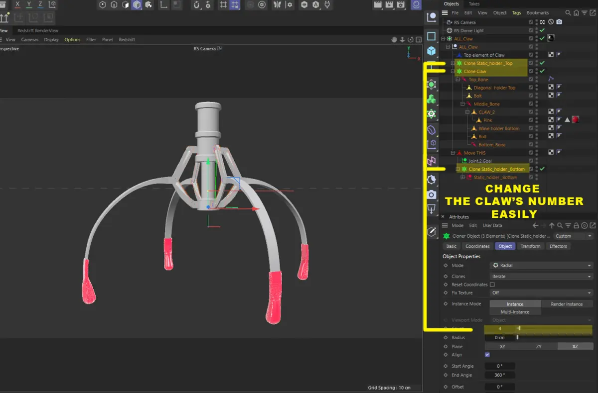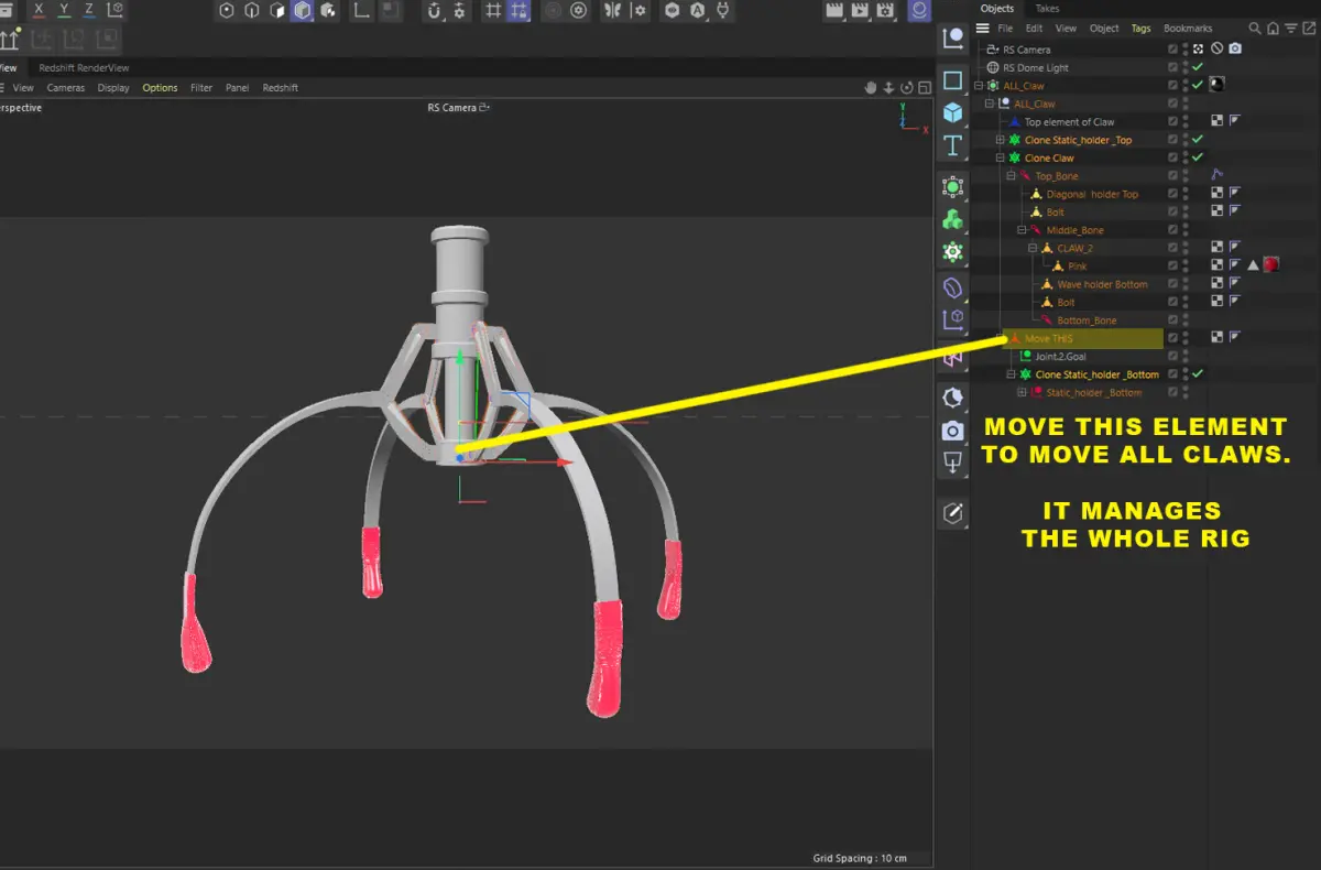3D Model of Metal Claw 9 with RiggingThe animation for the claw is set up using a rig, allowing you to control it easily. You only need to move the highlighted element on the screen, and all other parts will move automatically in response to rigging.
