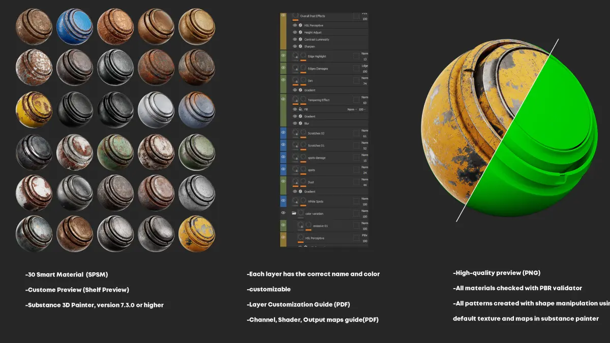 No effort texturing(drag and drop)Realistic lookHigh-quality previewEach layer has the correct name and colorNot heavyCustomizable100% made with substance painterAll materials checked with PBR validatorcompatible Substance 3D Painter, version 7.3.0 and highercustom shelf previewsAll patterns created with shape manipulation using default textures and maps in substance painter