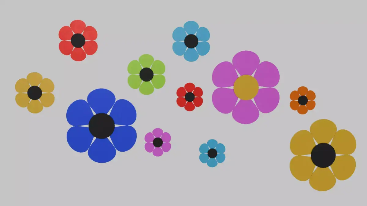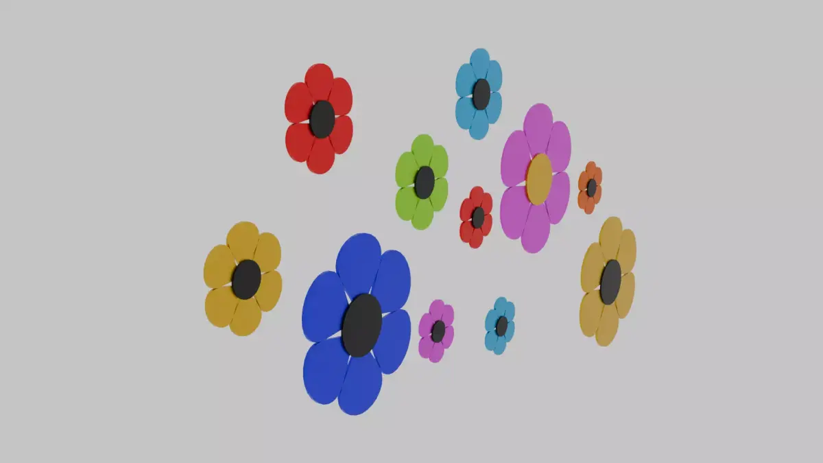 This cheerful metal fence flower display features eleven classic cartoon-style blooms arranged in three different sizes. Each flower has six rounded petals surrounding a raised center, creating a playful, friendly shape that works well in both whimsical and decorative scenes. The flowers come in multiple bright colors, adding variety and charm to the design. All pieces are parented together as a single display for easy placement, but each flower can be separated and repositioned individually as needed. The clean metal construction and simple stylized forms make this set ideal for garden-themed props, outdoor decorations, or any project needing a fun, colorful accent. Lightweight, versatile, and eye-catching, these flowers bring a joyful pop of personality wherever they’re used.