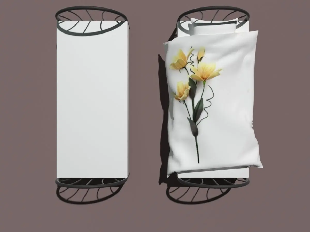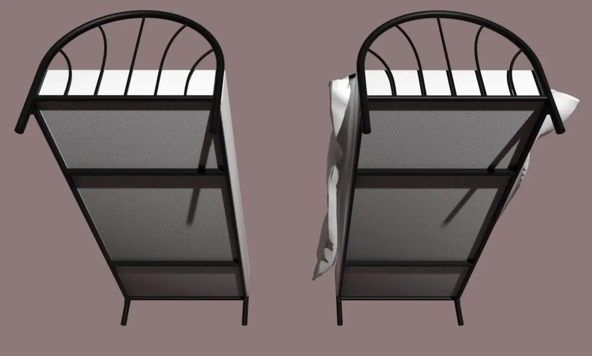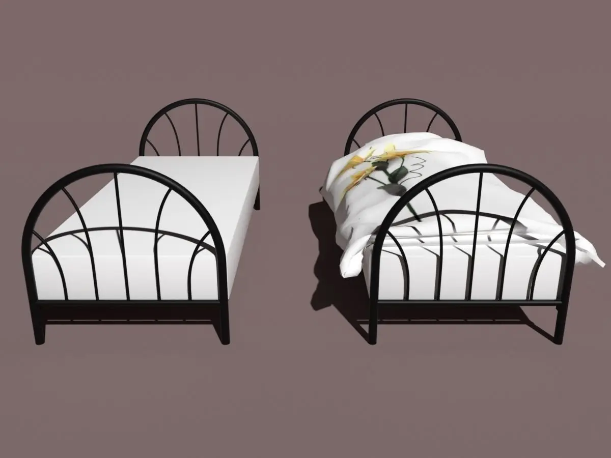 Metal frame single bed in two version - with pillow and sheets and with only mattress.The frame is made of powder coated steel in arc shapes.Industrial style