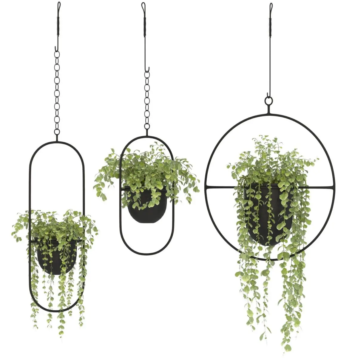 Description:High-quality 3D model of decorative metal hanging plant holders with green cascading plants. The set includes 3 unique geometrical shapes (oval and round), each with black metal frames and realistic hanging greenery. Ideal for interior decoration scenes such as living rooms, balconies, or modern cafe designs.