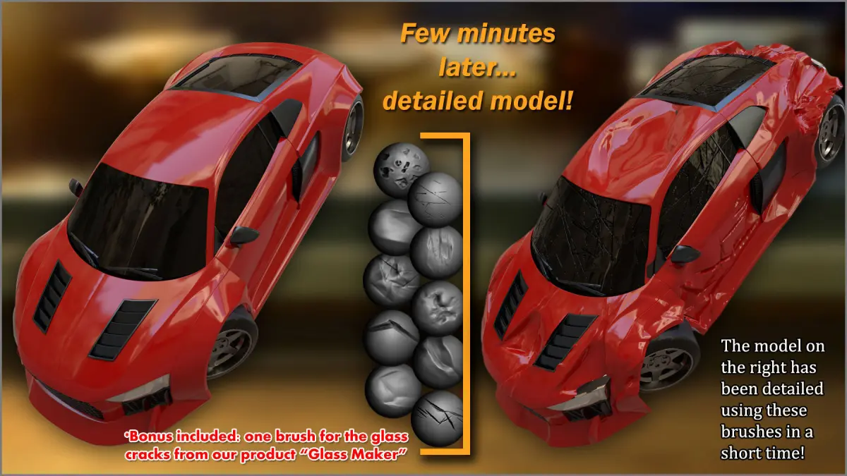 Metal Impact Maker for ZBrush contains brushes for sculpting damage, holes, dents, bumps, cracks, and impacts on metal. Use it for any genre (sci-fi, fantasy, or whatever) and for any 3d model, including armors, weapons, cars, bikes, other vehicles like military, tanks, robots, shields, and anything metallic that needs to look damaged.