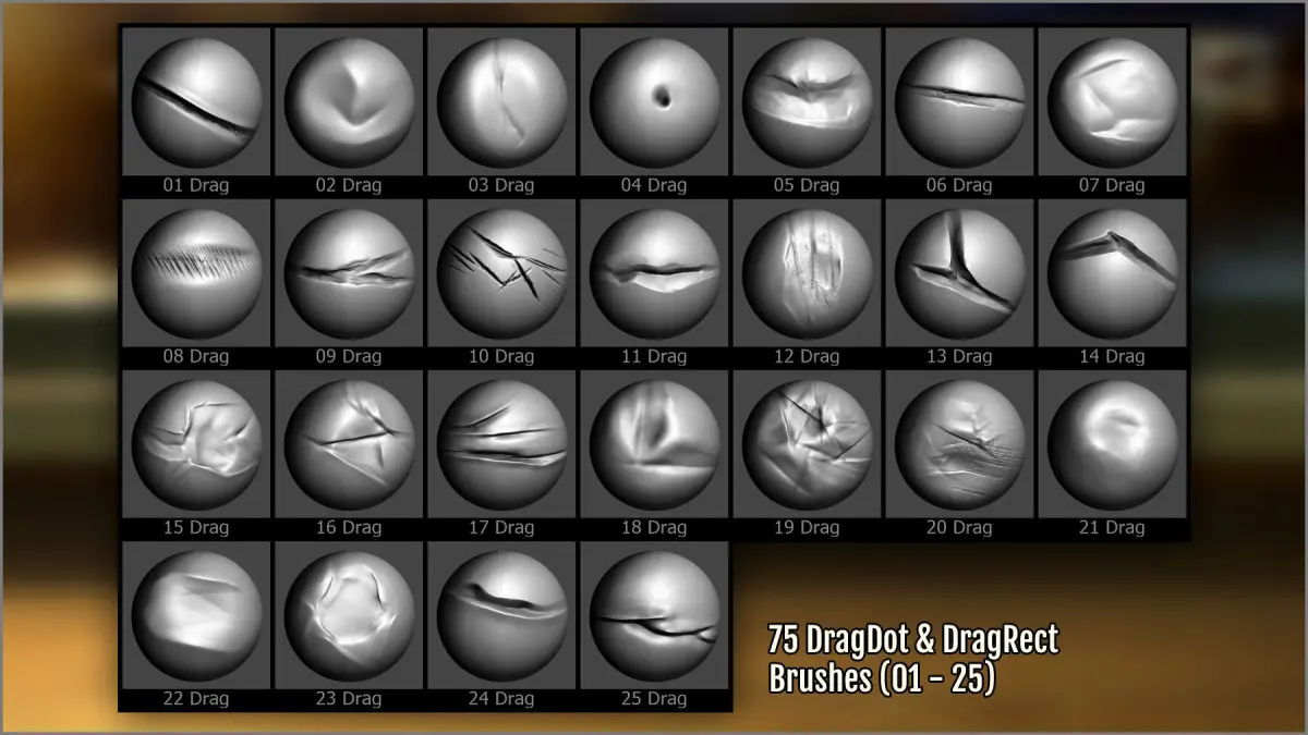 - 300 ZBrush brushes of different kinds: dragrect, dragdot, draw brushes, and spray.