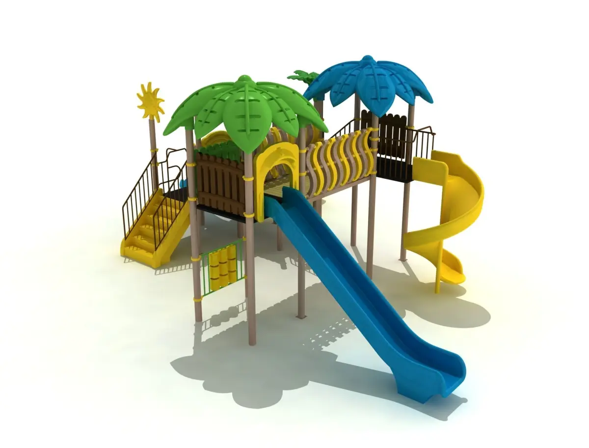 This is a metal 3d playground. include in bend Slide , tube slide , leaf roof, plastic barrier and polythene stairs, mountainer climber , oxo panel.