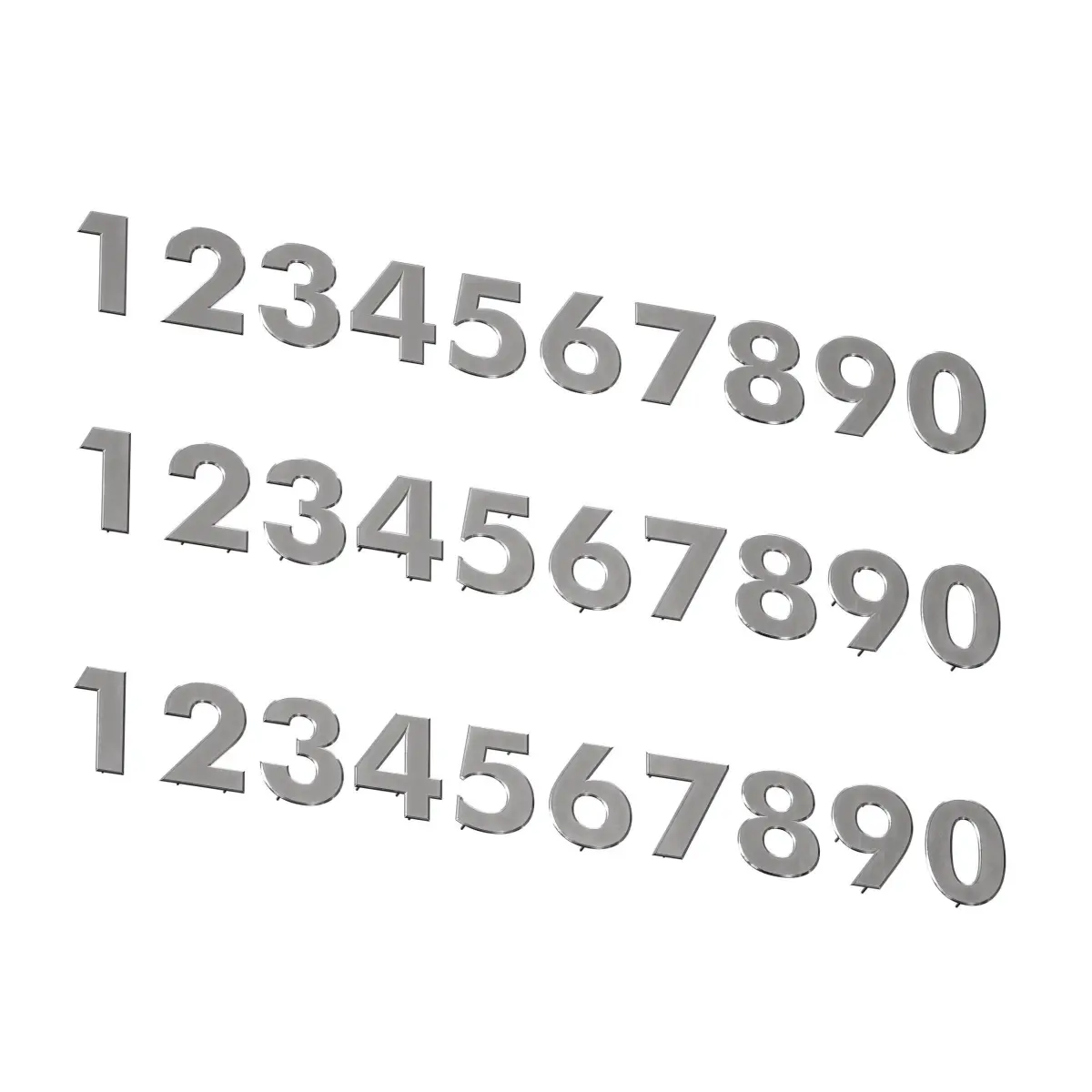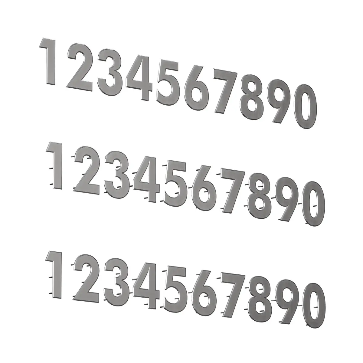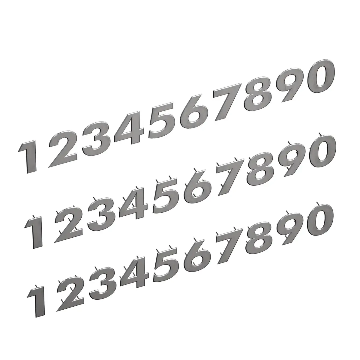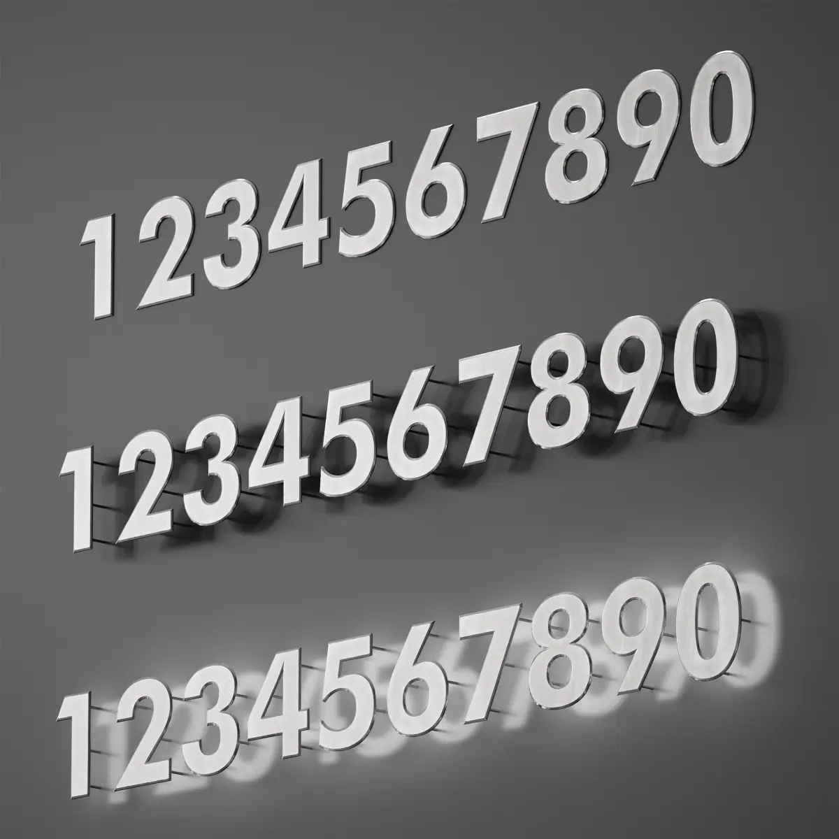 3D model of metal numbers from 0 to 9 with fastening tightly to the wall, with separation from the wall on hidden holders, as well as with backlighting. The numbers are made of metal, stainless steel. The height of the numbers is 15 cm. Can be used as numbering of houses, apartments, offices, entrances, floors, etc.
