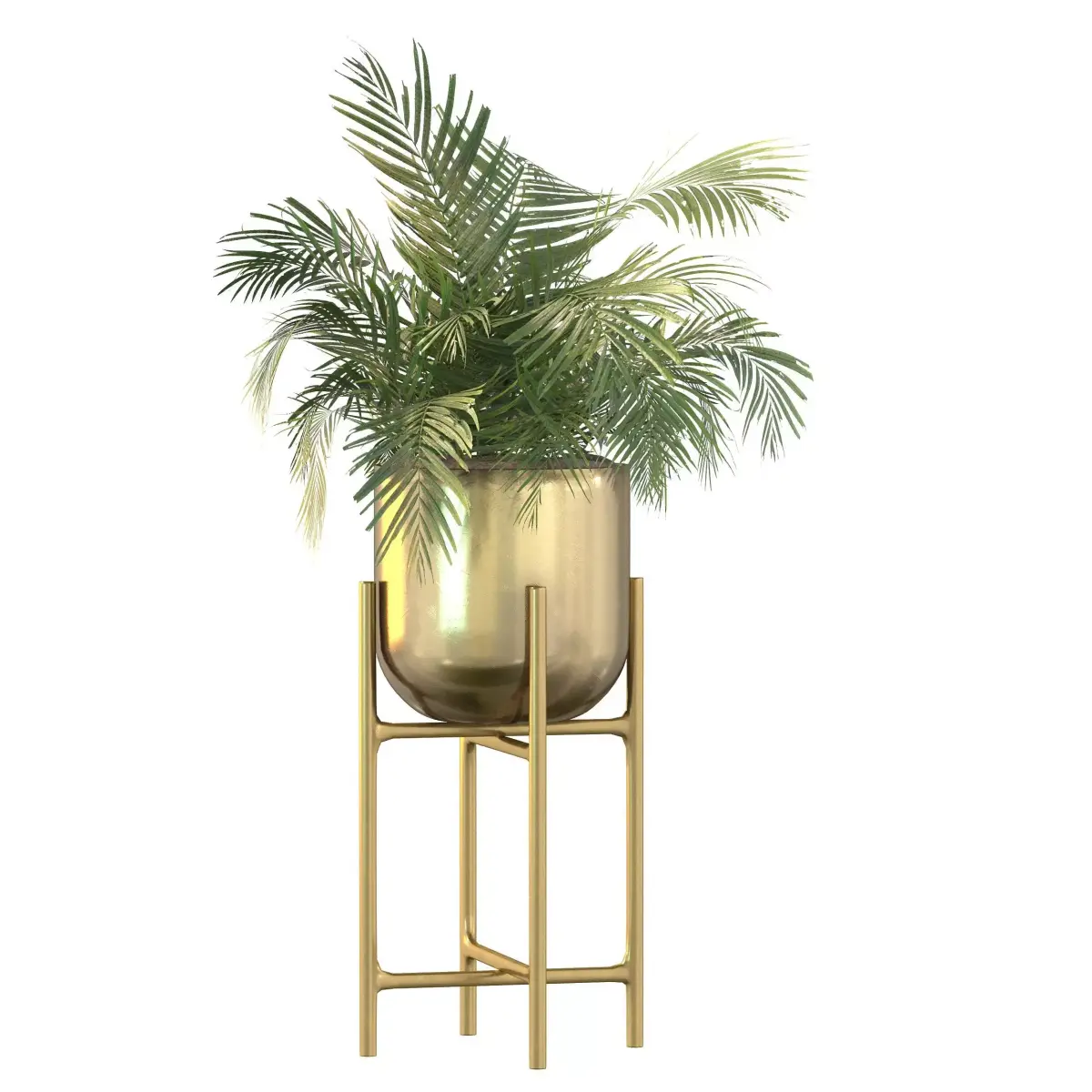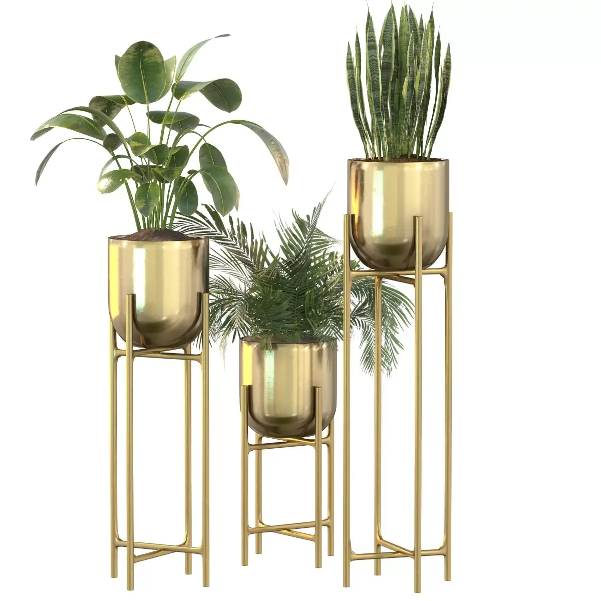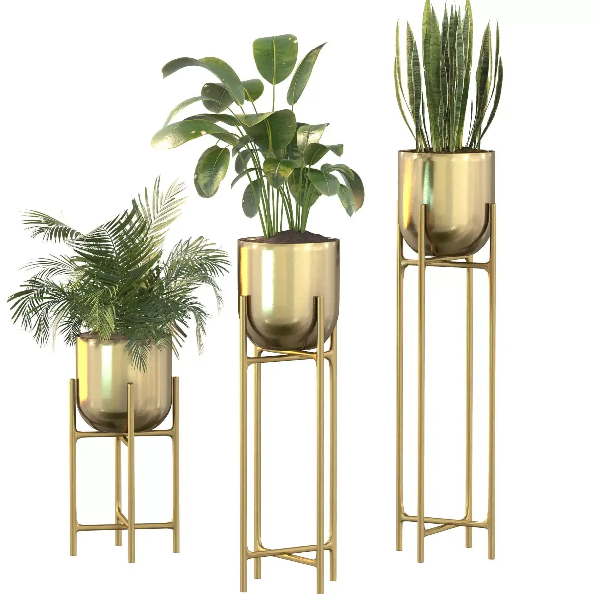 Description:This elegant metal plant set features three stylish gold planters on slender metallic stands, each containing a different lush green plant. The combination of luxurious gold finish with natural greenery creates a striking balance between modern sophistication and organic freshness.