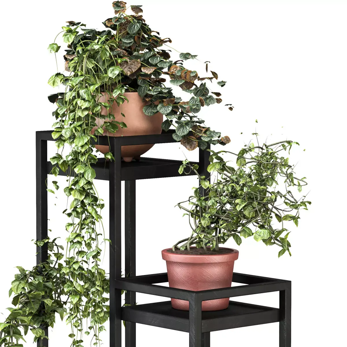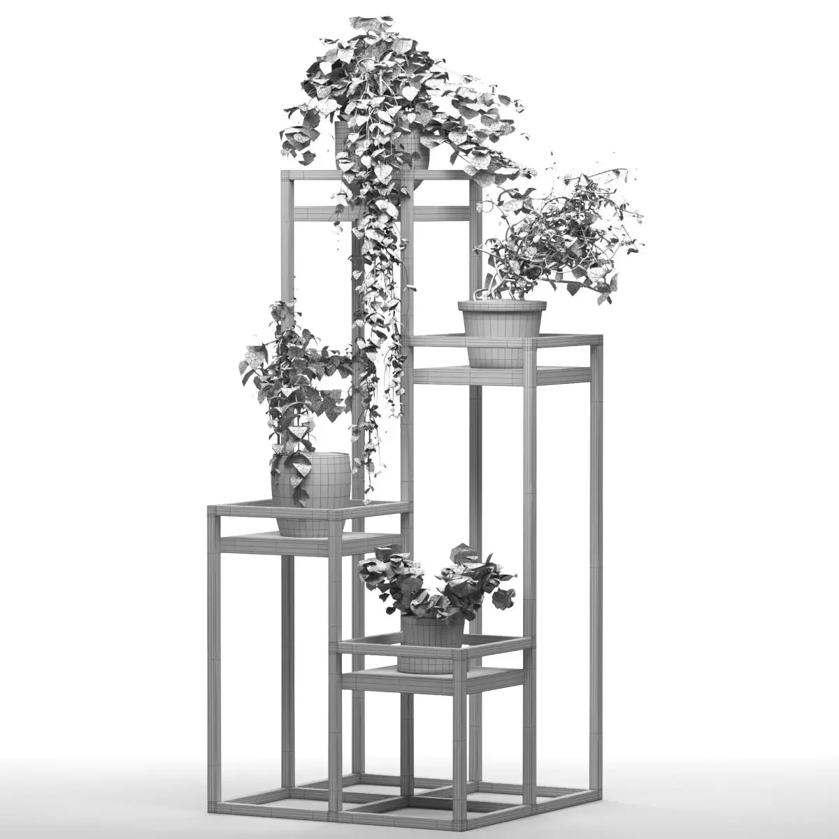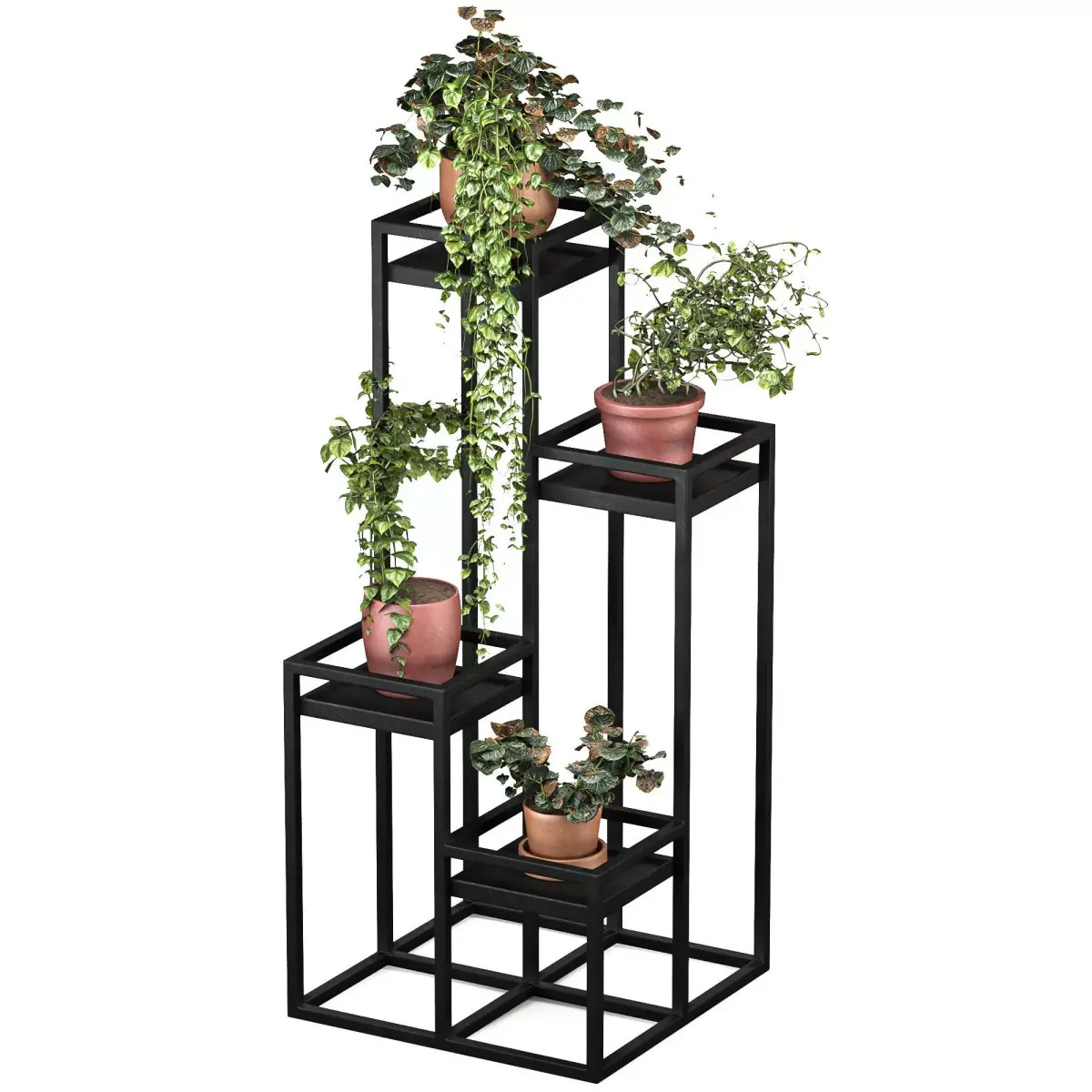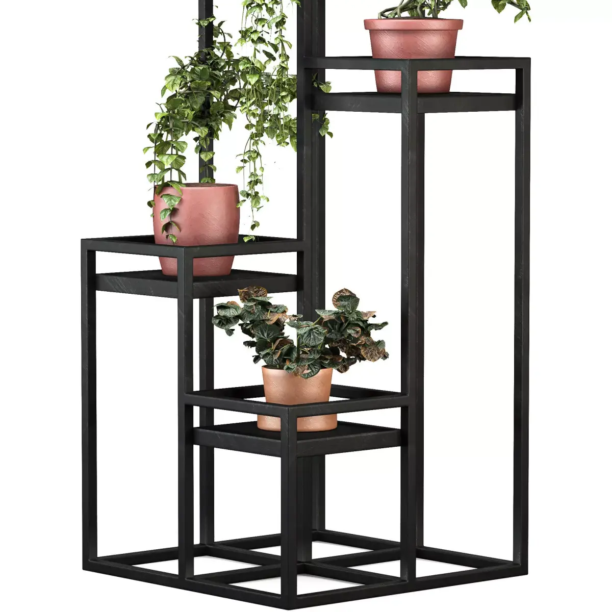 Metal Plant Set 14 is a modern decorative plant stand set designed for contemporary interior spaces.The model features a clean geometric metal frame with multiple height levels, allowing plants to be displayed in a visually balanced and dynamic composition.