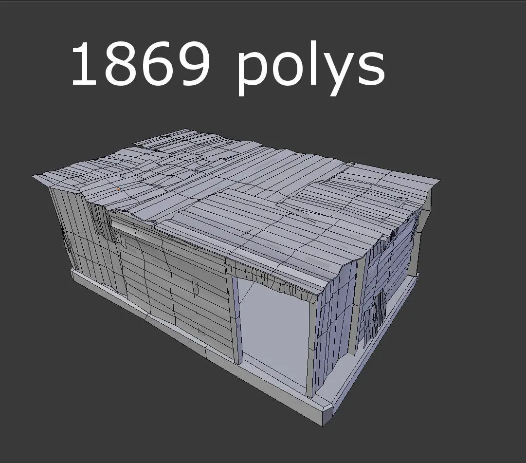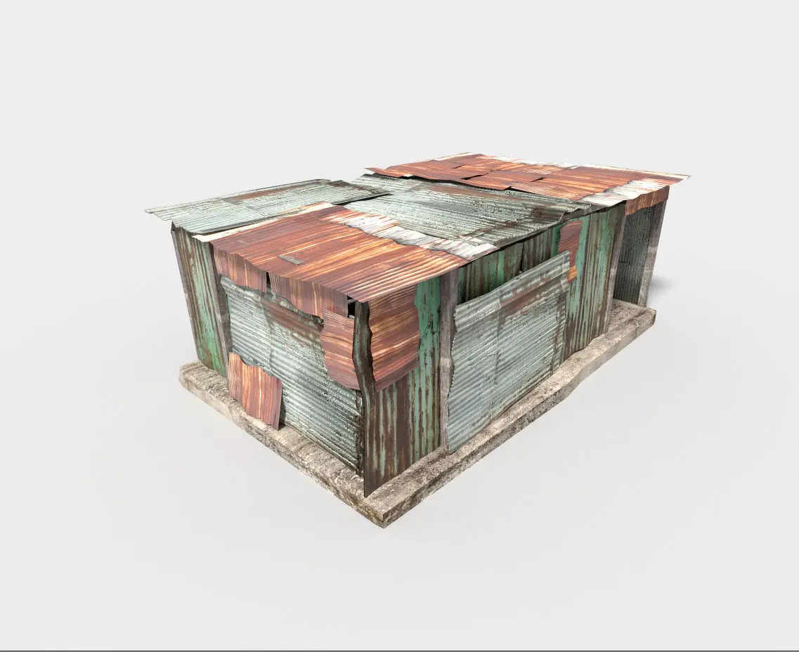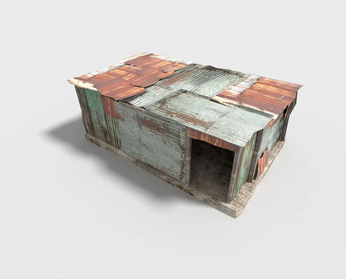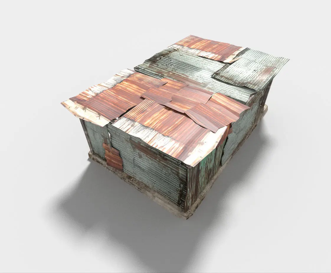 3D model of hut built of metal paltes and wooden logs. detailed textures and materials.