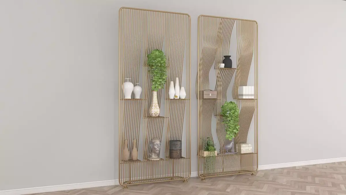 Metal shelf with figurines, indoor plants and caskets. This decorative shelf will make your interior more cozy and detailed.