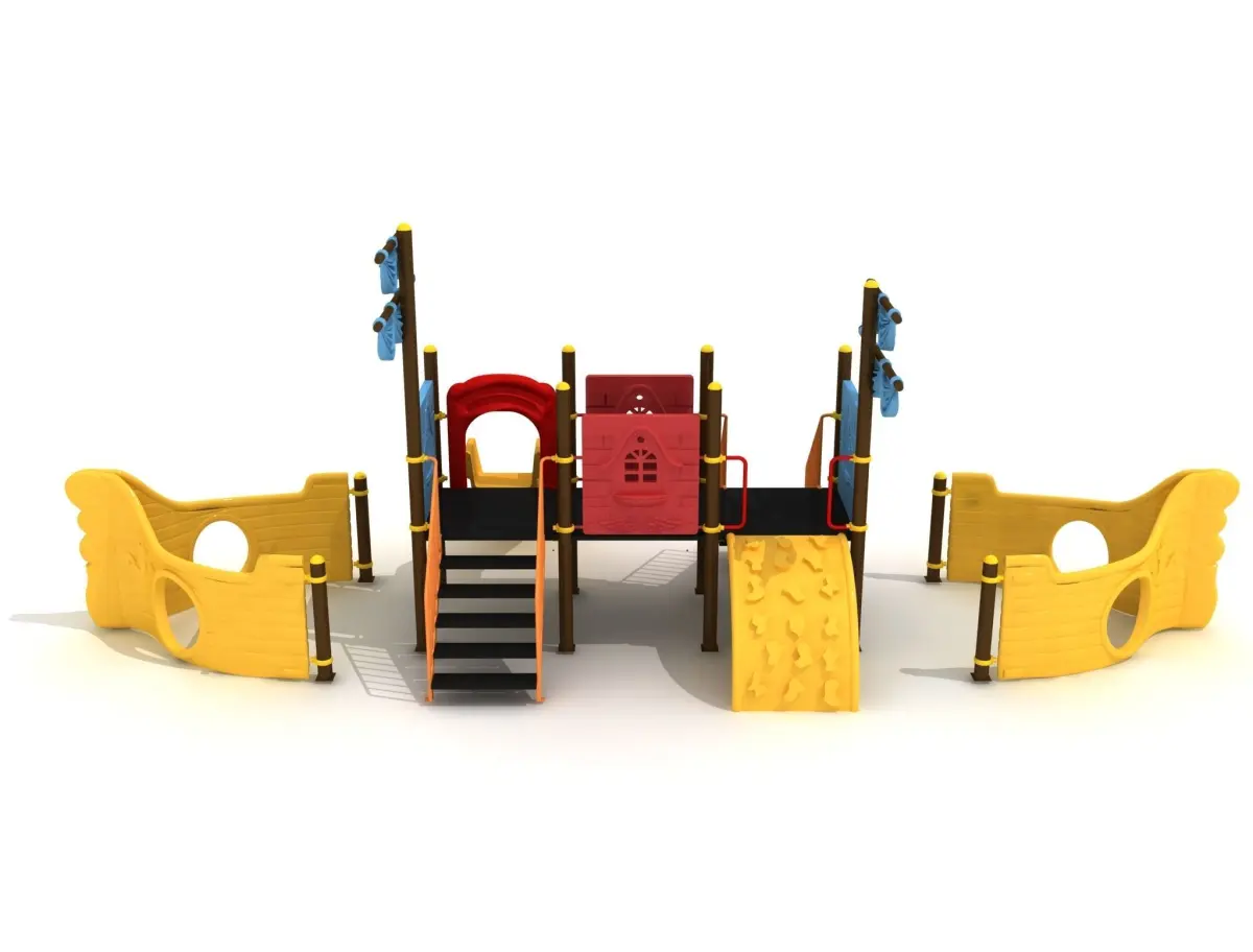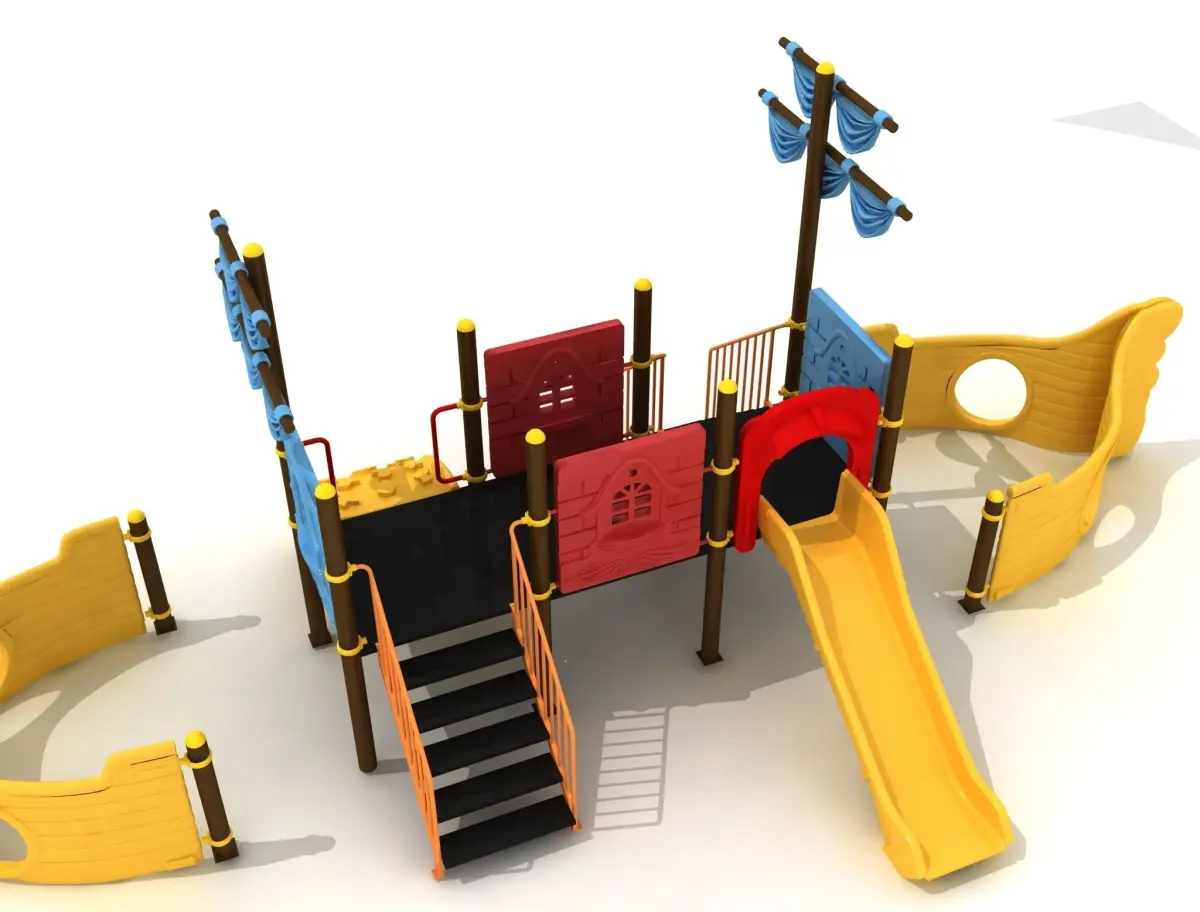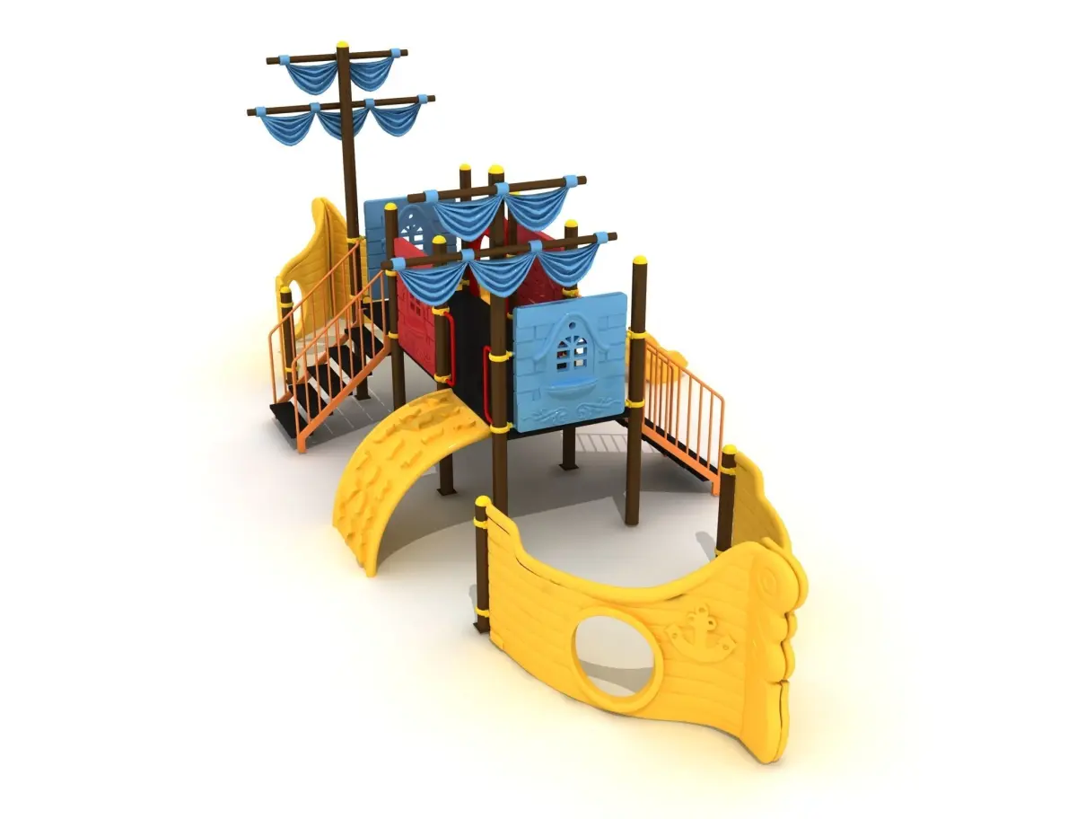 This is a metal 3d playground with ship concept. include in Slide , stairs, mountainer climber, polythene barrier .