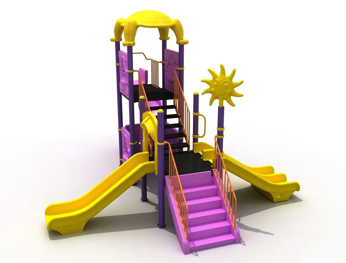 This is a metal 3d playground. include in bend Slide , flat slide , binary slide turtle roof, plastic barrier and polythene stairs .