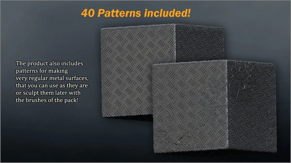 300 ZBrush brushes (75 DragRect, 75 DragDot, 75 Draw, and 75 Spray) for sculpting metal surface details.75 PSD Alphas that you can use in ZBrush and other 3D apps that use alphas. 2048x2048 pixels, 16 bits, grayscale, in PSD and JPG, for all 3D applications.40 Seamless Patterns that you can use in any app for making regular surfaces.ZBrush Surface Noise file included for loading the patterns with base settings.A PDF tutorial, that tells you how to use the brushes and patterns.PDF index of the brushes and patterns to choose them easier.A video tutorial, that you can also find on YouTube (in our channel), but is included in our product for your future reference.The ZBrush brushes include different kind of brushes: