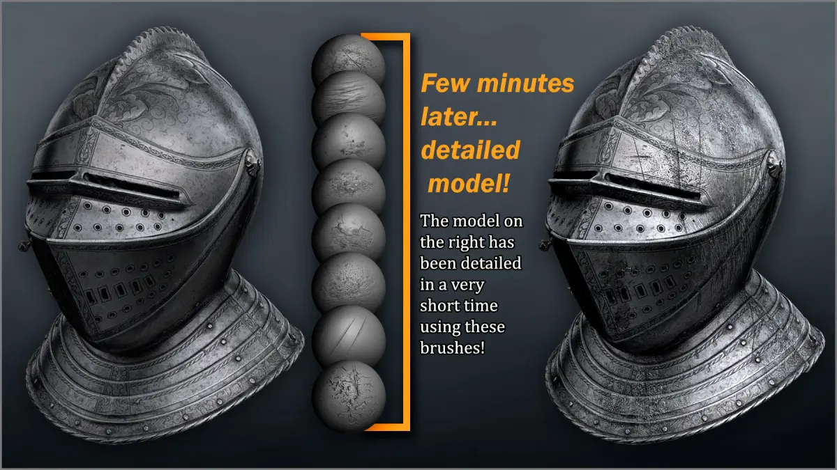 You can use it for detailing weapons of fantasy and contemporary, metal props, armors, sci-fi ships and robots, machinery, and everything metallic.