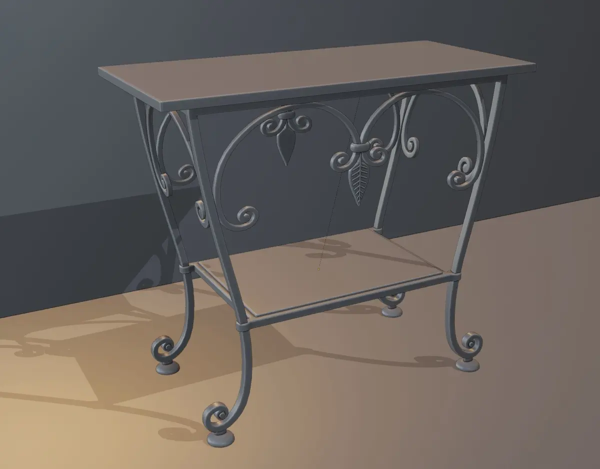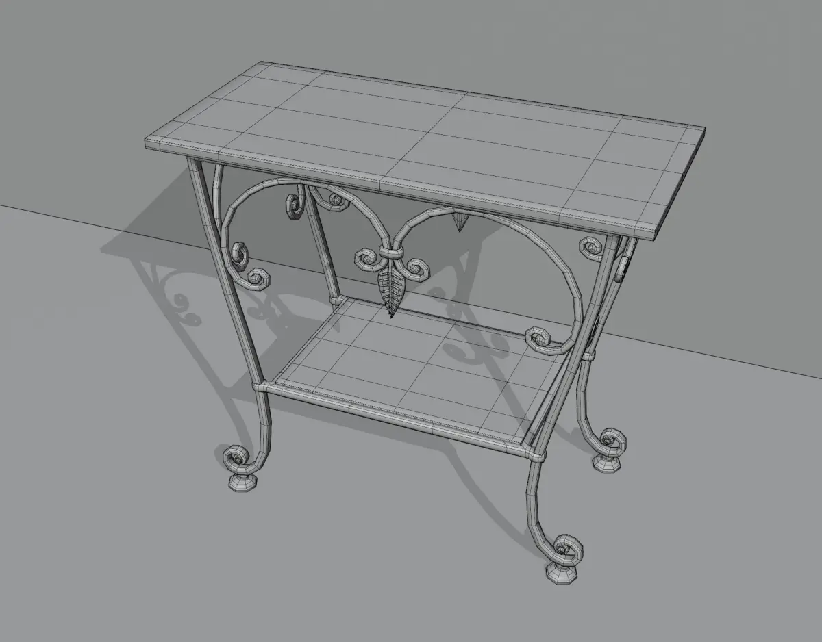 Forged metal furniture. Table with glass top. Three mesh model. Metal frame and two glasses. Top is big and small is bottom. (If desired, you can replace the glass with a wooden countertop)Metal frame in grunge style. Can be used as magazine or handout.