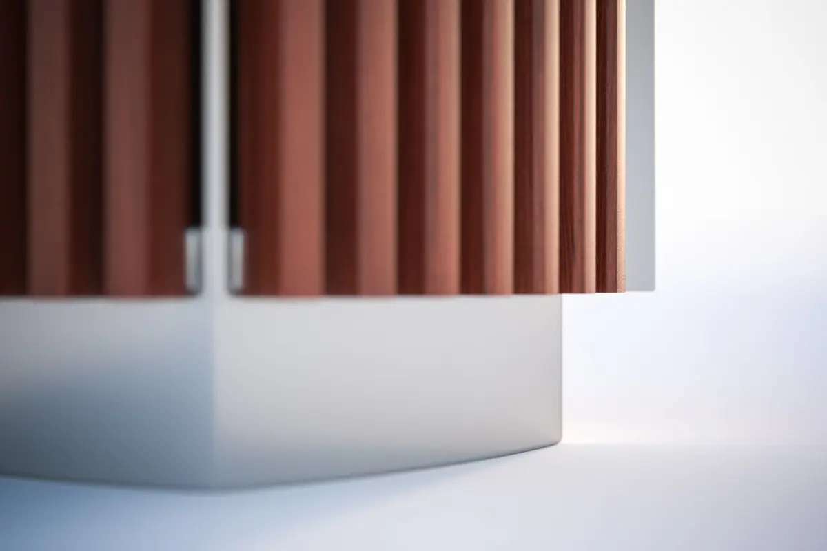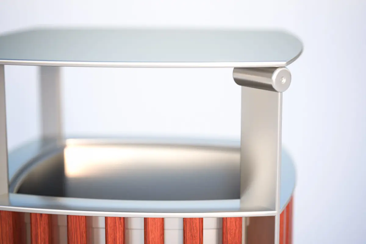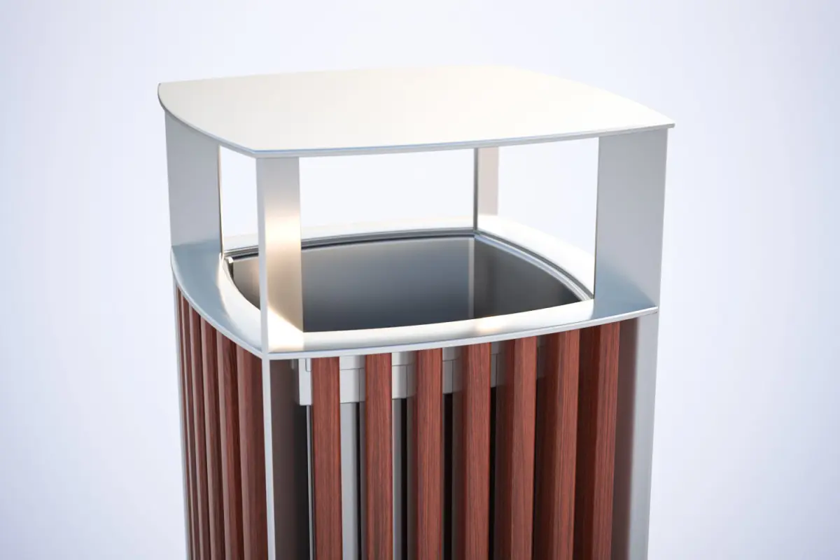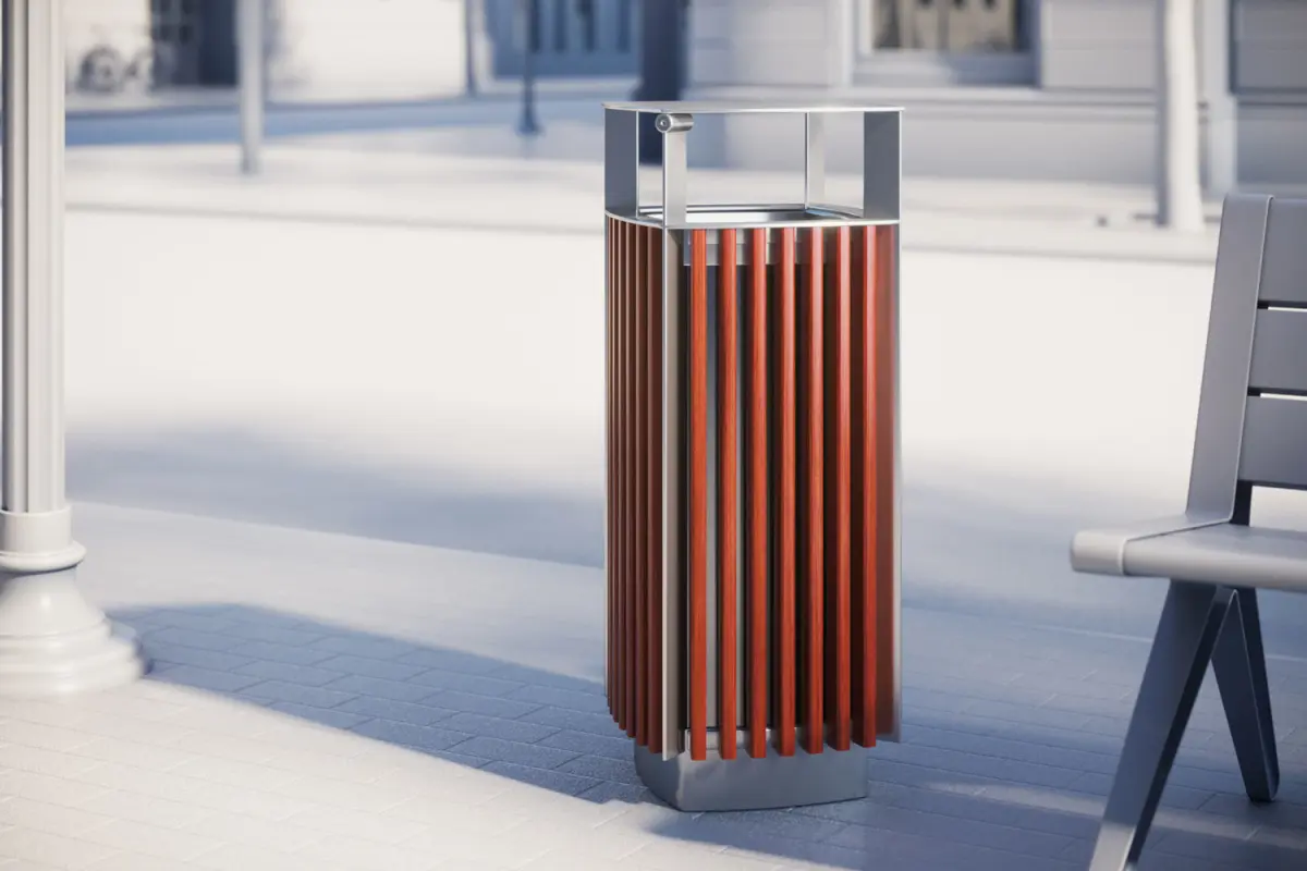 This realistic 3D model presents metal trash bin with a casing made of wooden boards arranged vertically.Model prepared for 3d architectural visualisations and other graphic works.