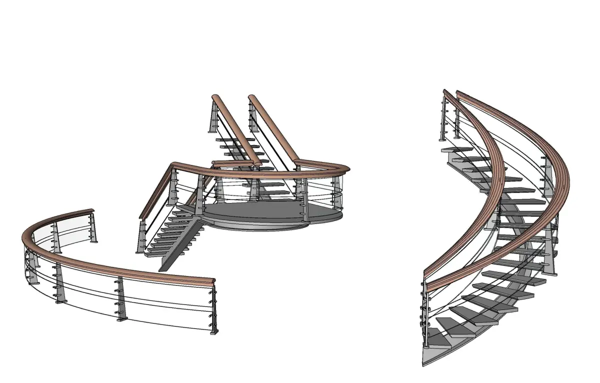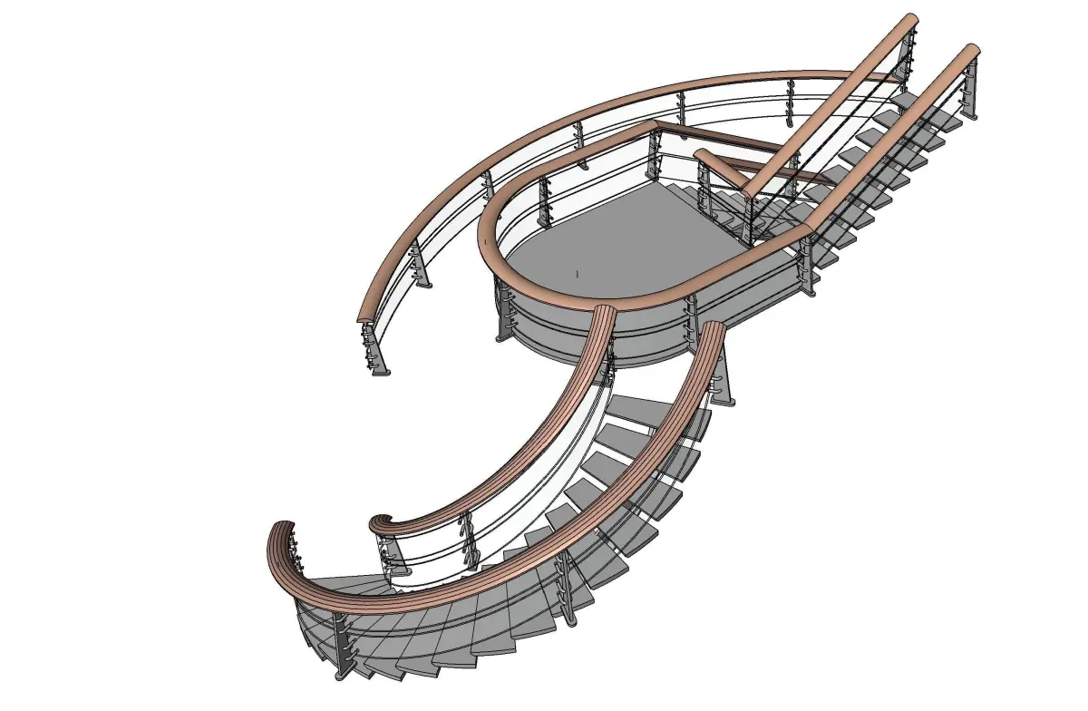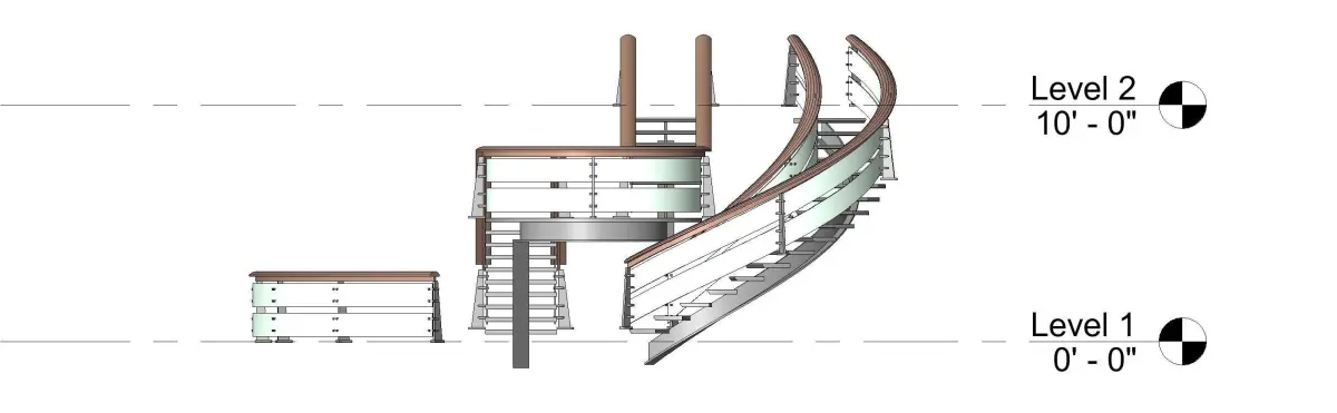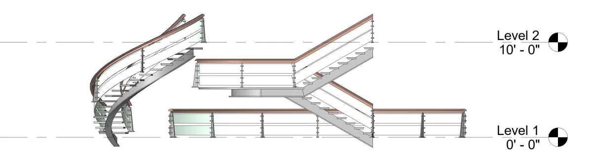 Revit modeling of a staircase with a metal and wood structure. The stair rises to a height of 10' (approx 3mts), width of 3' (0.9mts approx)
