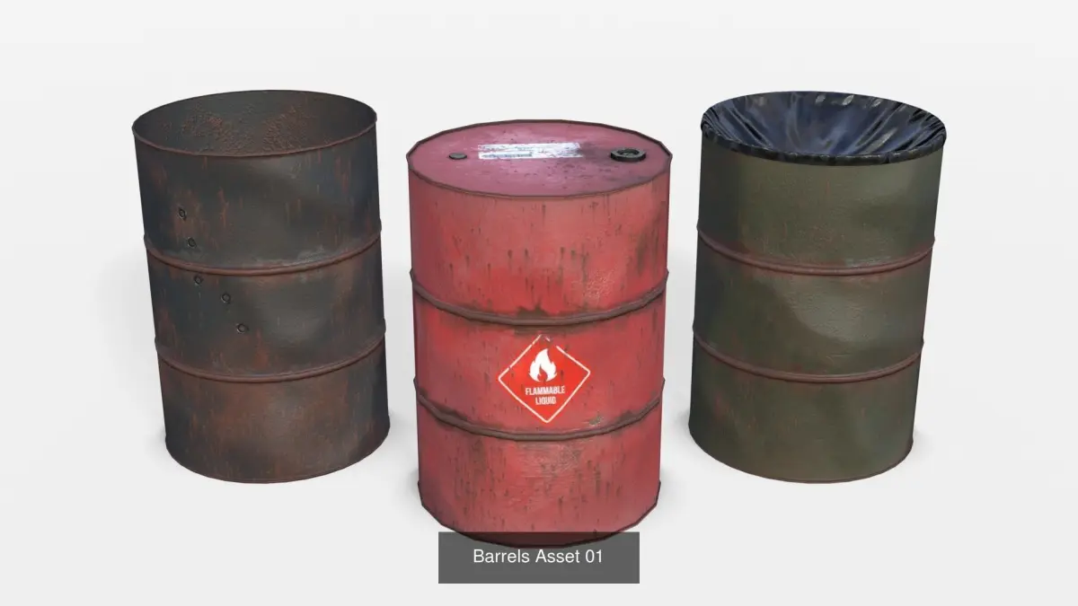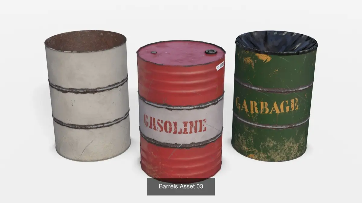 This 3D models collection includes a total of 12 metallic painted barrels. The asset includes 3 variations of barrels (opened, closed and trash use).