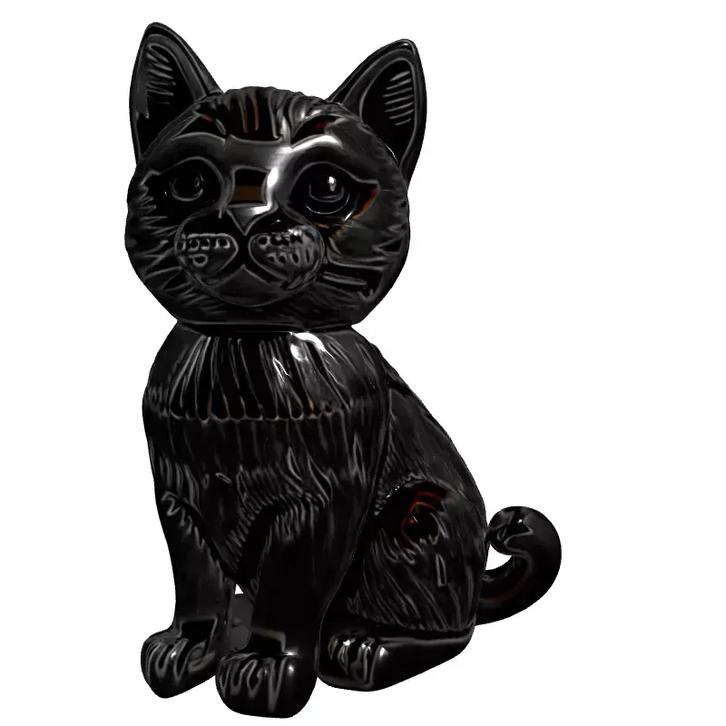 This is a meticulously crafted 3D model of a stylized sitting cat figurine, designed with exquisite detail. It features a luxurious metallic finish, suggesting polished silver or chrome, with a reflective surface that catches light beautifully. The model boasts intricate engraved or sculpted fur details, adding a sophisticated texture and depth to its elegant design. Its stylized form captures the essence of a cat while maintaining a refined, decorative aesthetic, making it a focal point in any scene. This asset is perfectly suited for enhancing various digital environments. It serves as an exquisite decorative accent in architectural visualization projects, elevating interior design renders, product presentations, or virtual staging. With proper optimization, it can be adapted for real-time applications like games or augmented reality (AR) experiences as a unique prop. It is also excellent for digital art, animation, or collectible showcases, adding a touch of elegance to any creative project. The solid, detailed mesh makes it highly suitable for 3D printing, allowing for physical reproduction of this charming piece. The model features clean topology and is fully UV unwrapped for easy material application. It is designed with PBR (Physically Based Rendering) workflows in mind, ensuring realistic material representation across different renderers. Supported file formats include GLB, OBJ, STL, ABC, DAE, FBX, USD, and PLY, ensuring broad compatibility across various 3D software. Optimized for high-quality static renderings, it can also be easily prepared for real-time engines with baked textures if needed. Enhance your scenes with this unique and elegant metallic cat sculpture.