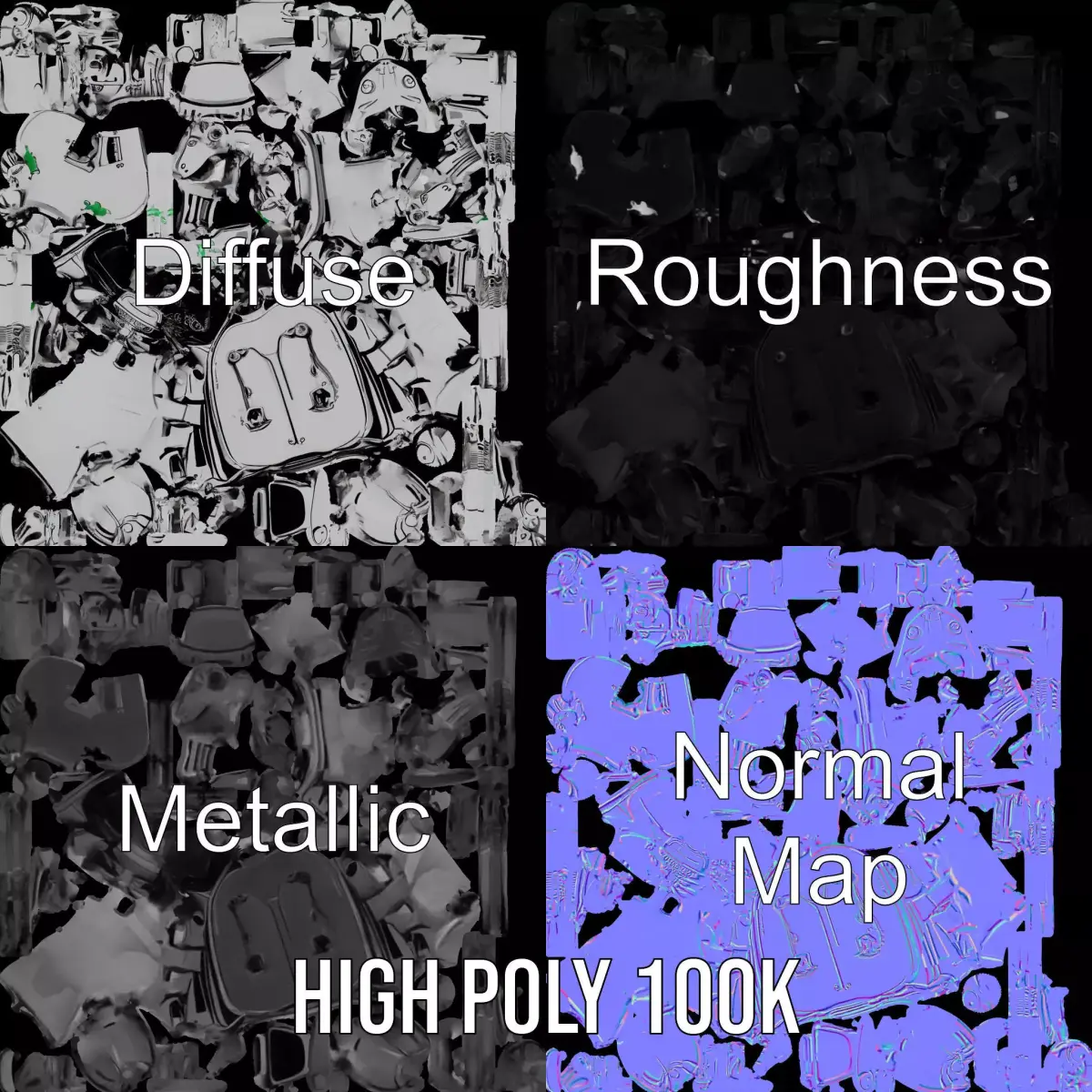 The model's textures are PBR, Diffuse, NormalMap, and reflection/roughness/metallic, which are suitable for any modern rendering engine. All models accurately unwrapped and have no overlapping UV.
