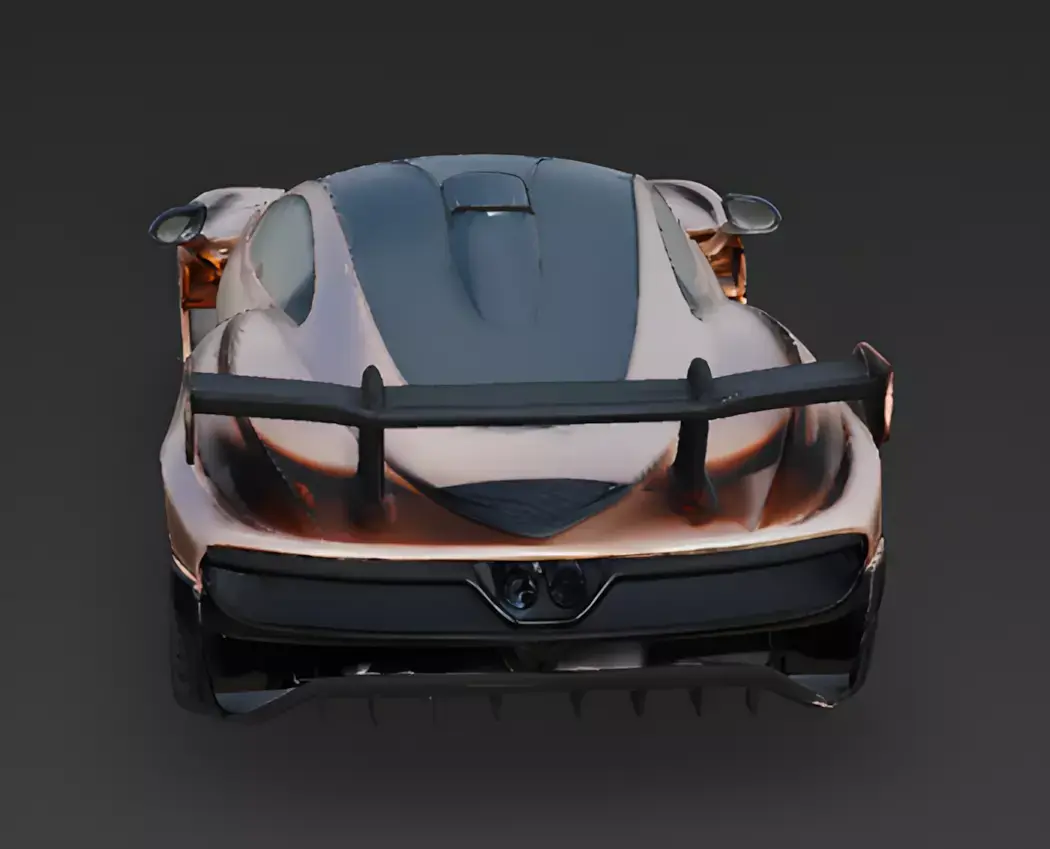 Carbon Fiber AccentsTo emphasize its lightweight and high-tech nature, the model incorporates extensive carbon fiber detailing. This textured material is visible on the front splitter, side skirts, side mirrors, and the massive rear wing, providing a high-contrast, industrial aesthetic against the rose gold body.