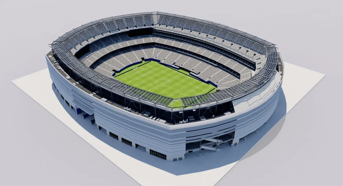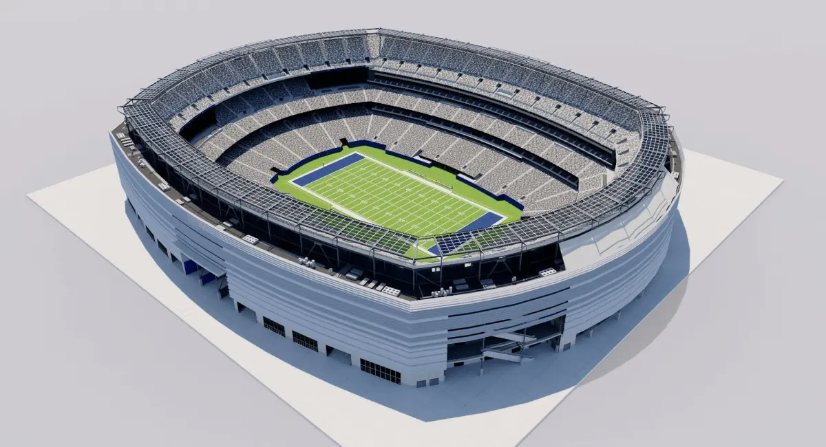 Model created with NFL and soccer pitch. Possibility of creating another sport inside. Ask before buying. Starter model.Approximate dimensions. Bleachers and seats in 2D texture. Render setup not included.