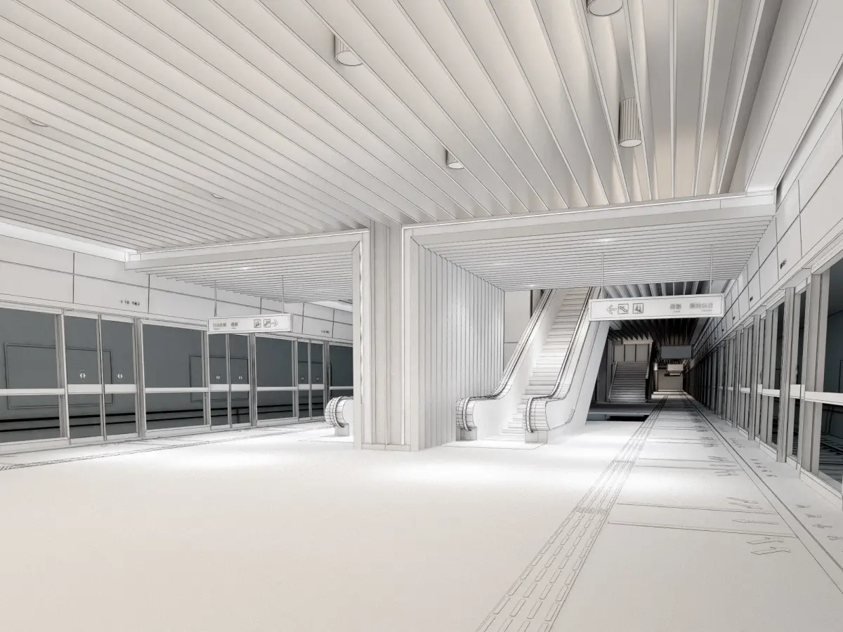 This is a modern subway station, including subway, platform, exit, stairs, tunnel and billboard