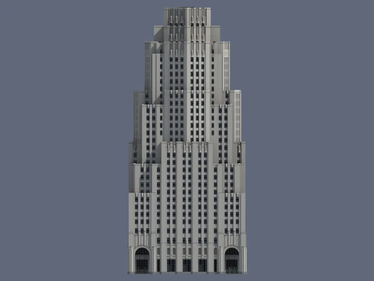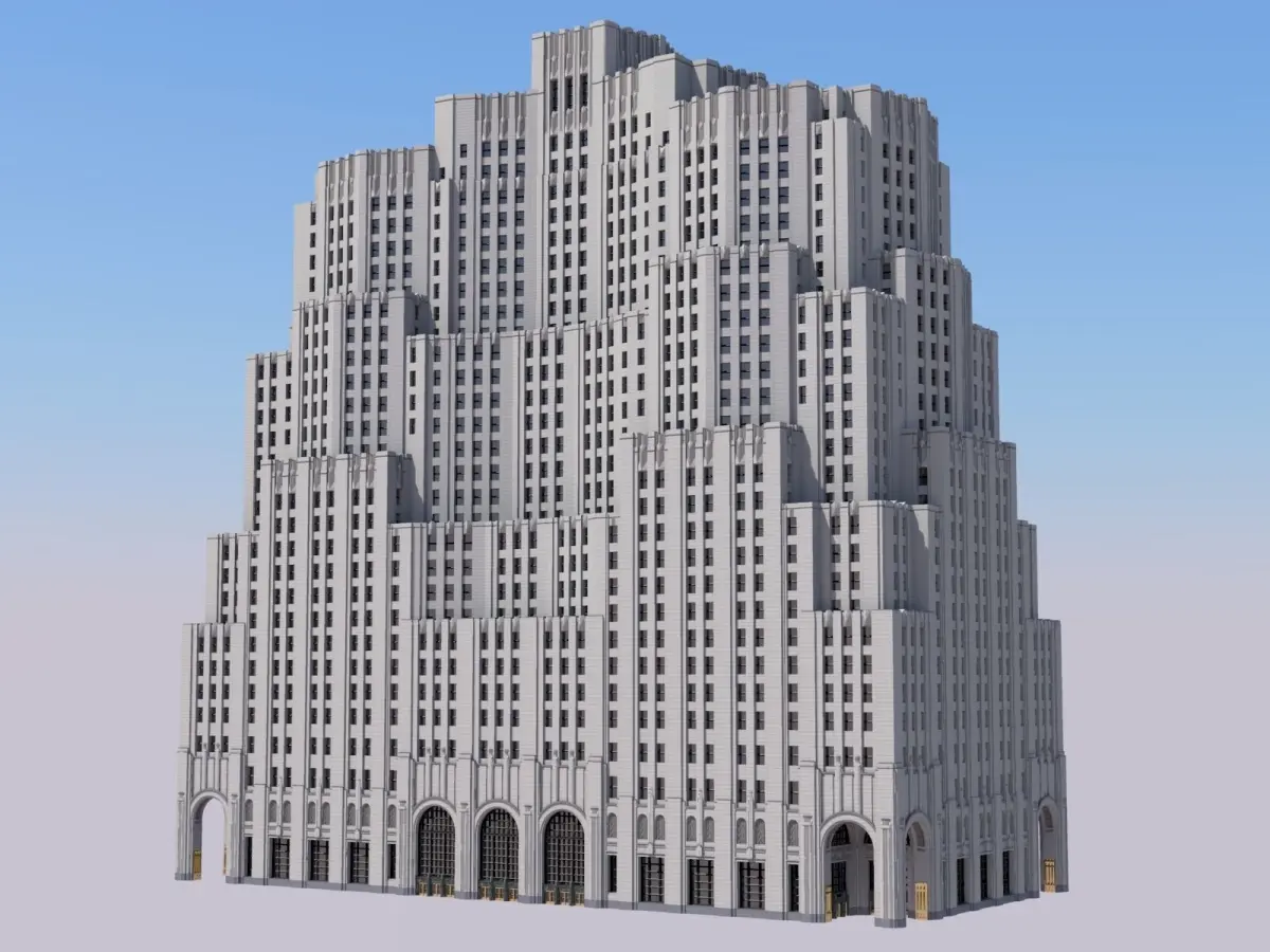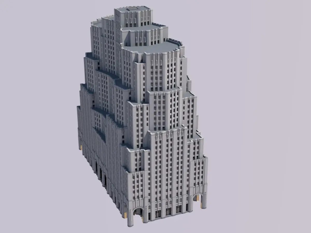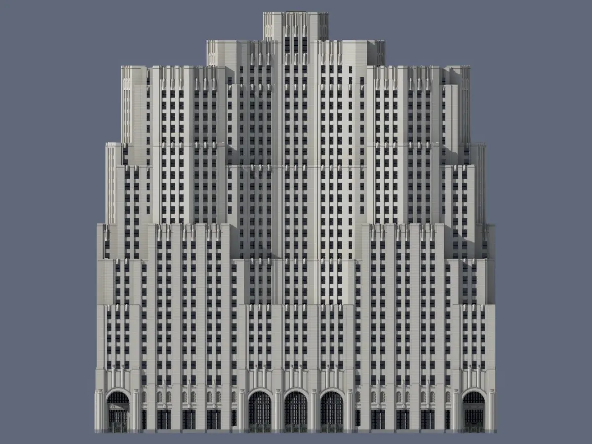 Perhaps no other building in more perfectly embodies New York's interwar skyscraper boom as this one. Plans for a massive expansion to Metropolitan Life's existing iconic clocktower, once the tallest in the world, took form and evolved over the course of the 1920s. Construction began in 1929, raising up half of the existing building on the east side of the block facing Park Avenue. Plans were soon adjusted envisioning a 100-story skyscraper soaring around 1,300ft (400m) into the sky, making it the world's tallest building. Mere weeks later, the devastating stock market crash and ensuing depression cut down the lofty plans almost as soon as they were announced. Nonetheless, construction continued in two more phases: one to construct the northwest side of the building, and the second to complete the final southwest side. After 20 volatile years, the Metropolitan North Building was capped out in 1950 at its final, much-reduced height. Another noteworthy feature of the building was the skybridge that connected the two Metropolitan Life buildings (not included in model). The skybridge was removed in 2020 as the complex underwent extensive renovations.