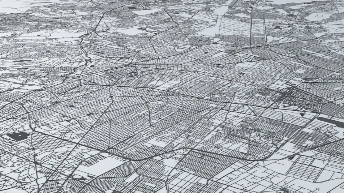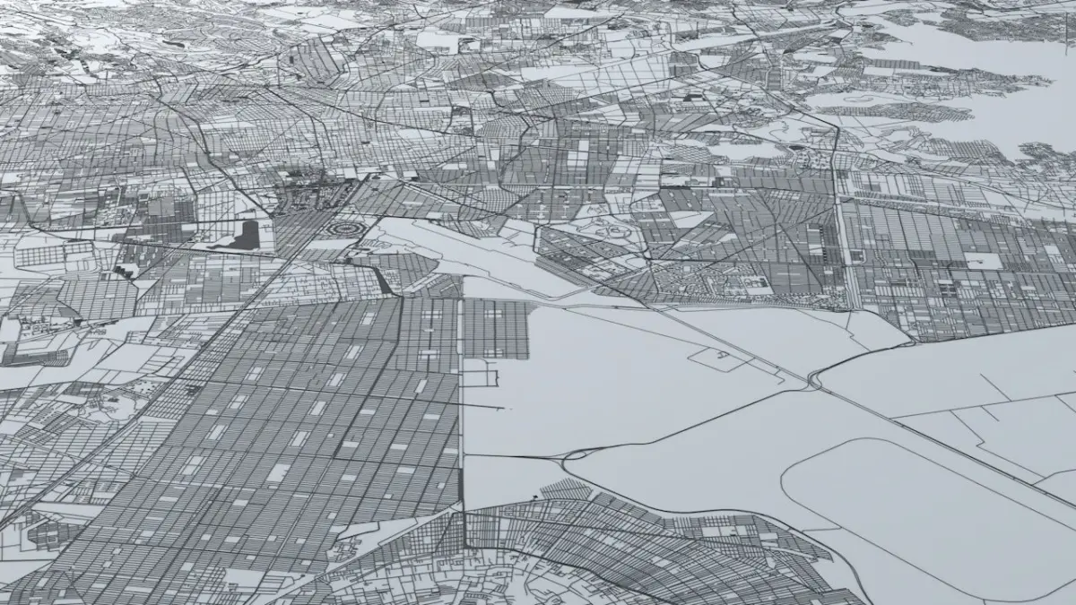 - the model is positioned on a flat surface (road network is on the “floor” - no elevation data included)