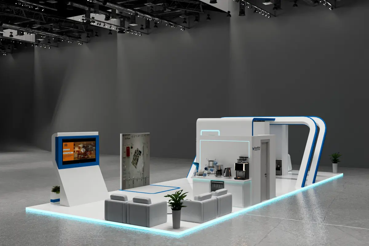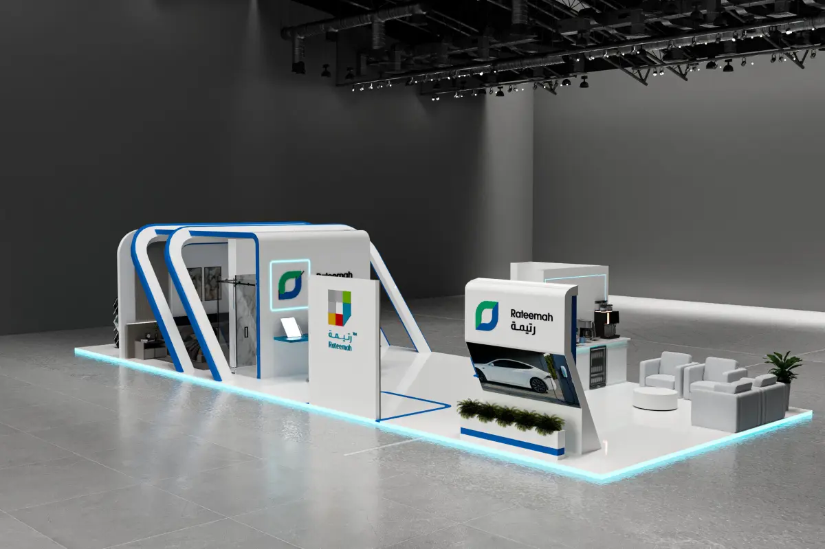 This is an exhibition booth design that you can adjust and use for your required design. I created this with 3ds max 2023 and all the rendering settings are included. adjust your size and render. Branding you will have to make it more beautiful.