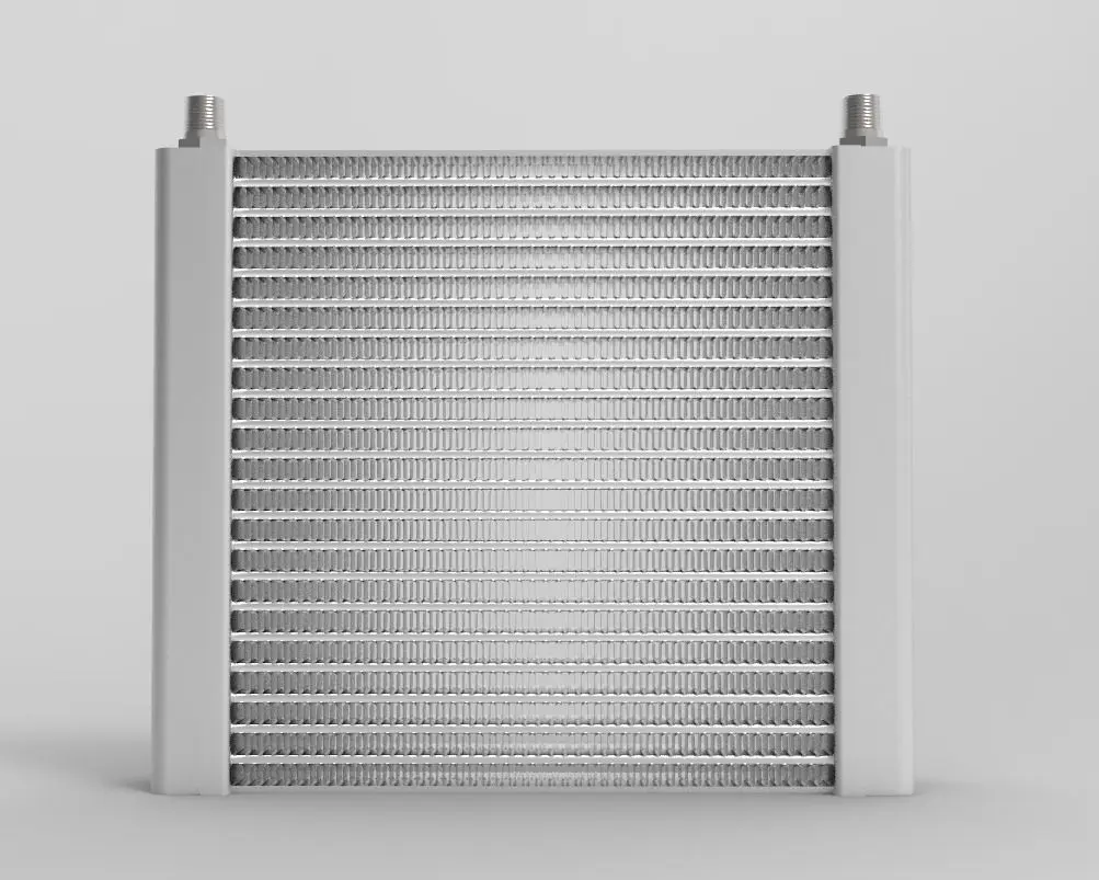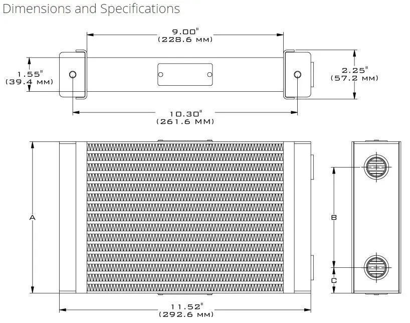 The MHX 500-series coolers feature -10AN female O-ring boss ports on the same side of the end tank for convenient line routing. Optional fittings are available in -6AN, -8AN, -10AN, and -12AN JIC male flare threads.