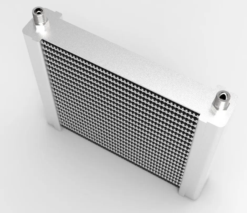 A major design focus was to minimize welds and brazings to make these coolers stronger, lighter, and less prone to leaks. All four end caps are single-piece CNC-machined billet aluminum. The rows consist of laser-welded, thin-gauge aluminum tubes stuffed with turbulators to maximize heat transfer while minimizing weight. The dual-pass design also maximizes heat transfer efficiency.