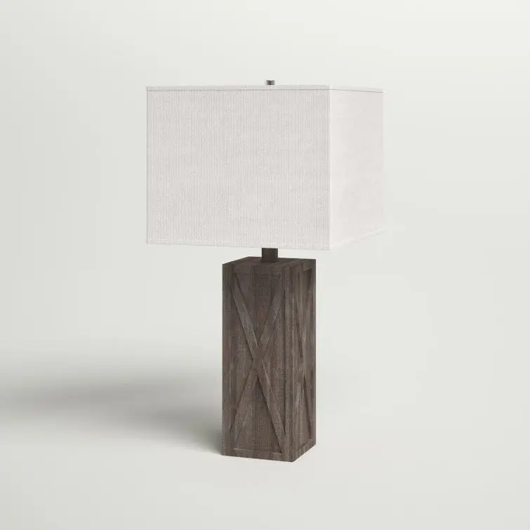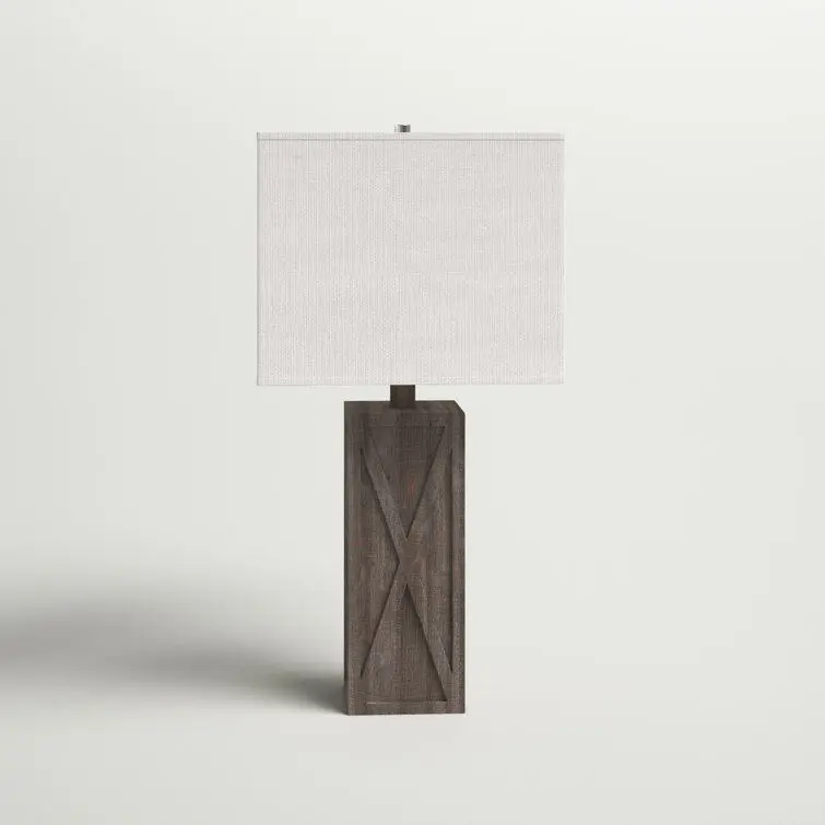 - Barn door-inspired accents and a wood-like finish makes this table lamp a coastal farmhouse accent on your end tables or nightstands. The rectangular base is made from plastic and has a brown finish with a faux wood grain to create a rustic look