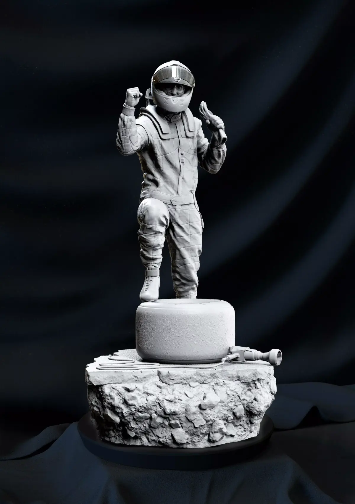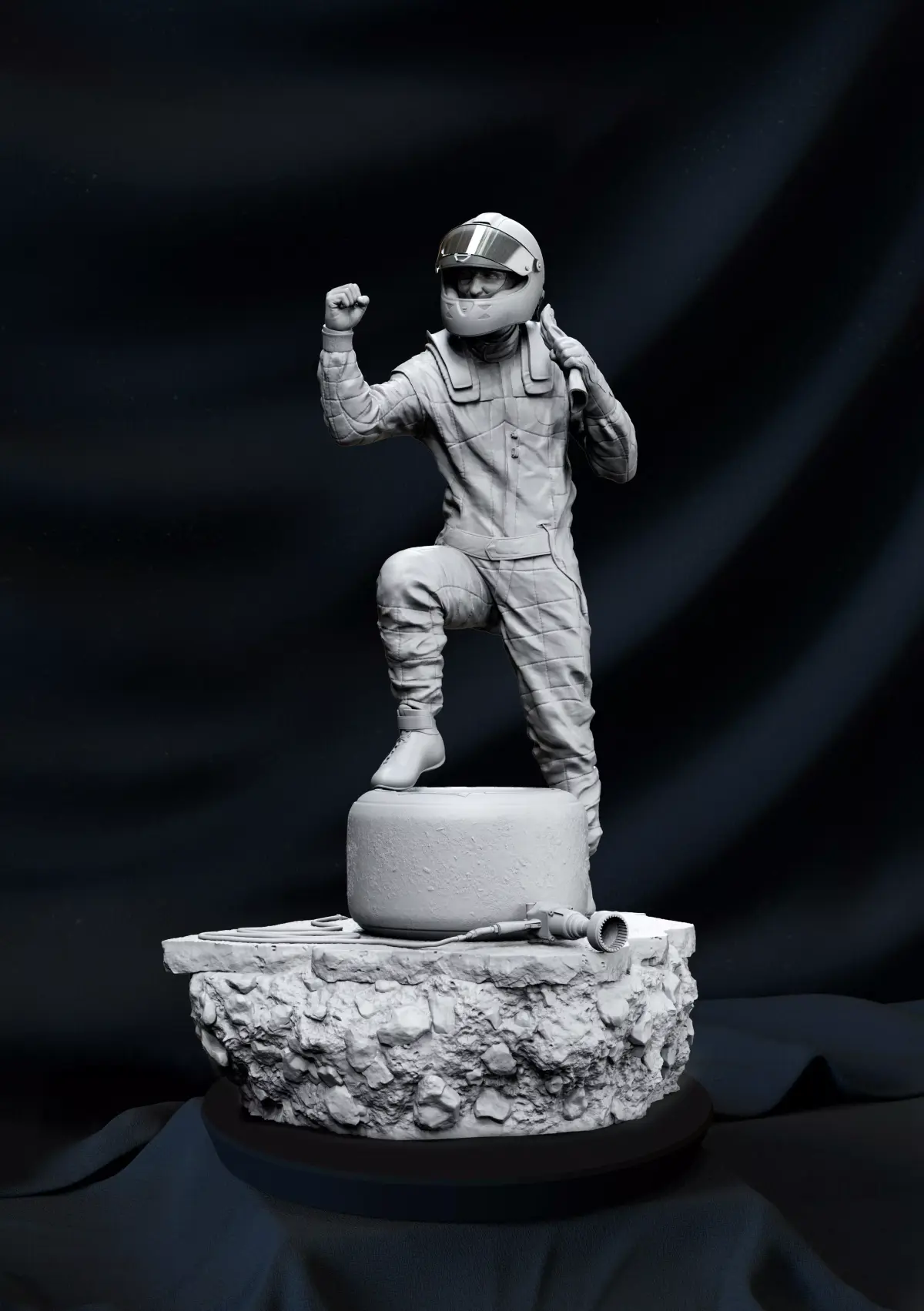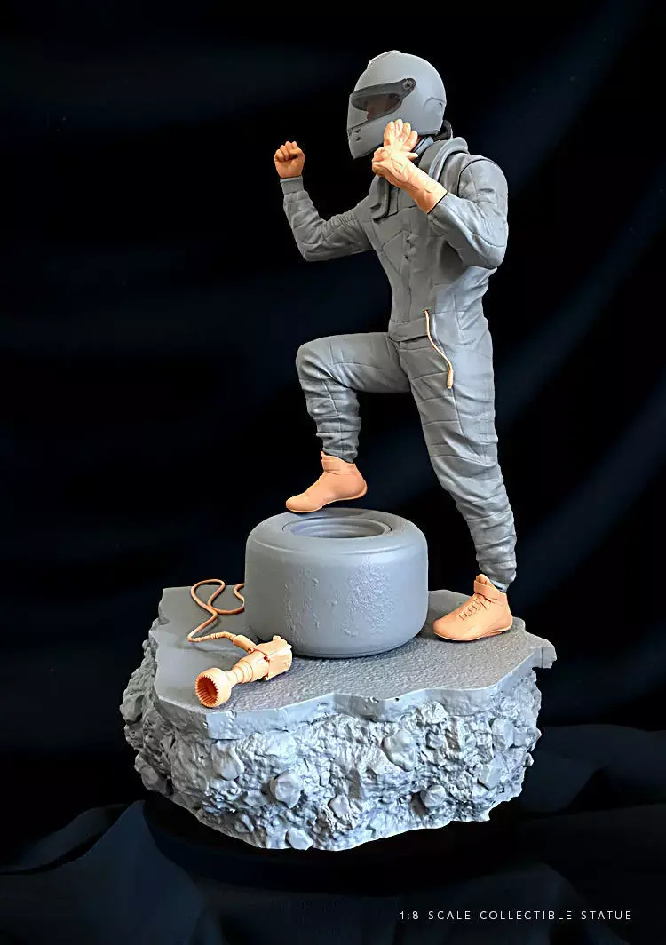 The Statue stands 28cm Tall.He comes with 2 portraits. One with his helmet on and with an open and close visor (Should be printed in Clear Resin).The other one is with his Baseball Cap. He stands on top of part of the track leaning on a scrubbed in tyre and wheel.