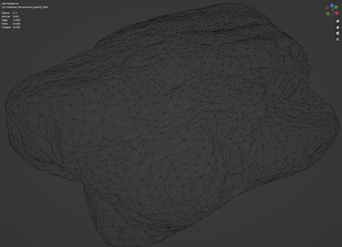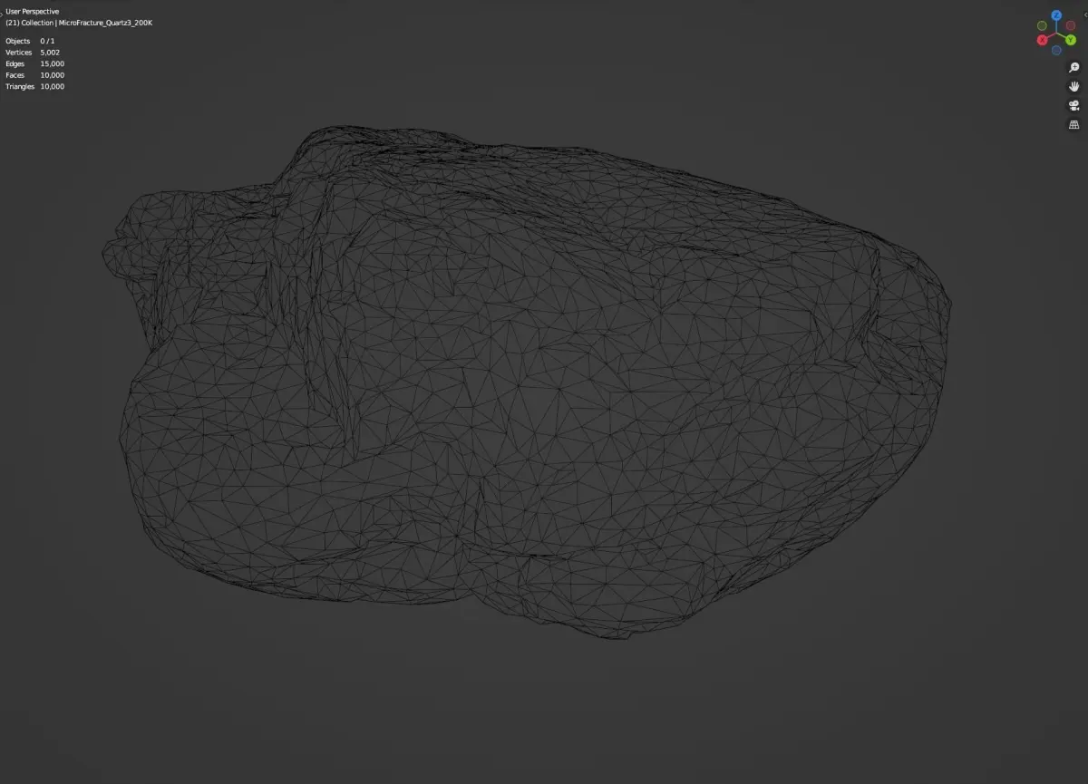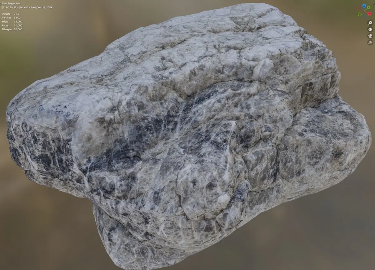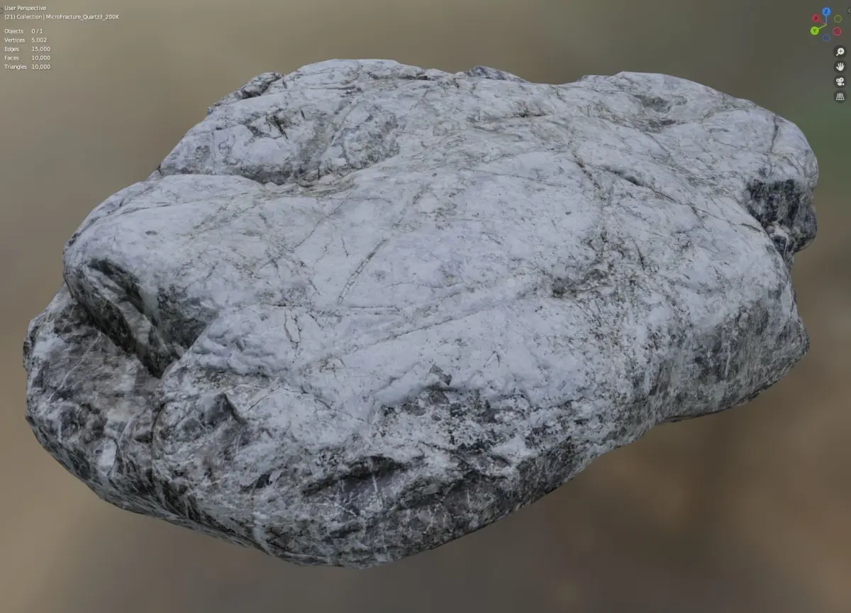 Photorealistic MicroFractured Quartz made from Photogrammetry. 8K Texture Files : Color, Normal, and Ambient Occlusion. Model origins are centered by mass. Models are provied as FBX and OBJ for maximum interoperability with 3d programs and game engines. LODs are available with the following face counts: 1K, 5K, 10K, 200k, 2Mil, 15Mil