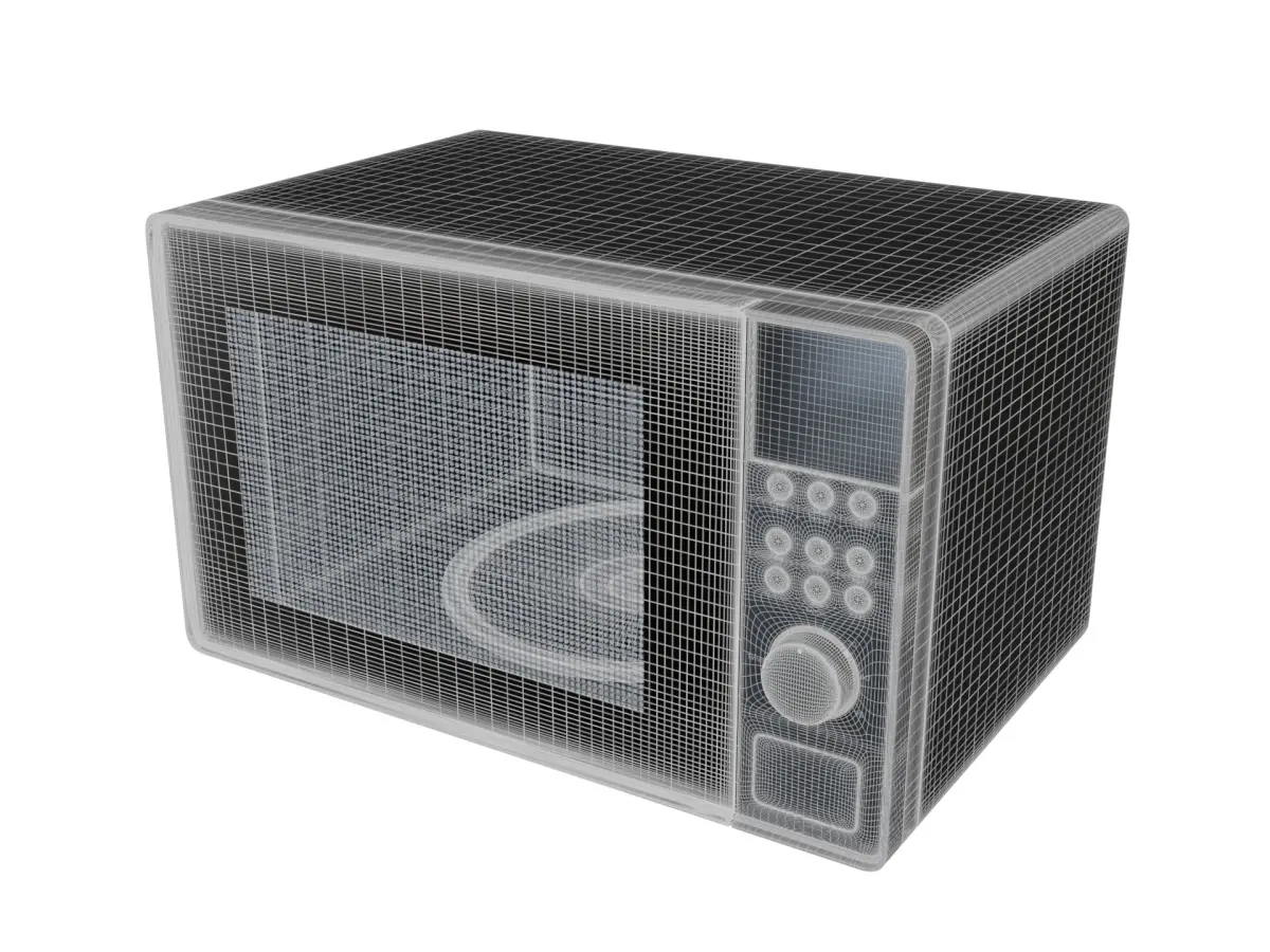 A space-saving microwave oven in a sleek charcoal gray color, designed for seamless integration into modern home decor.