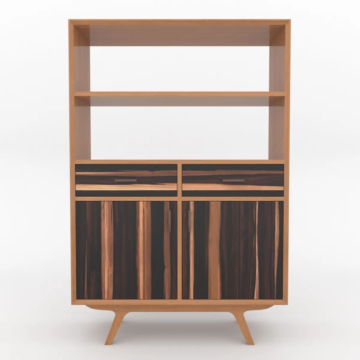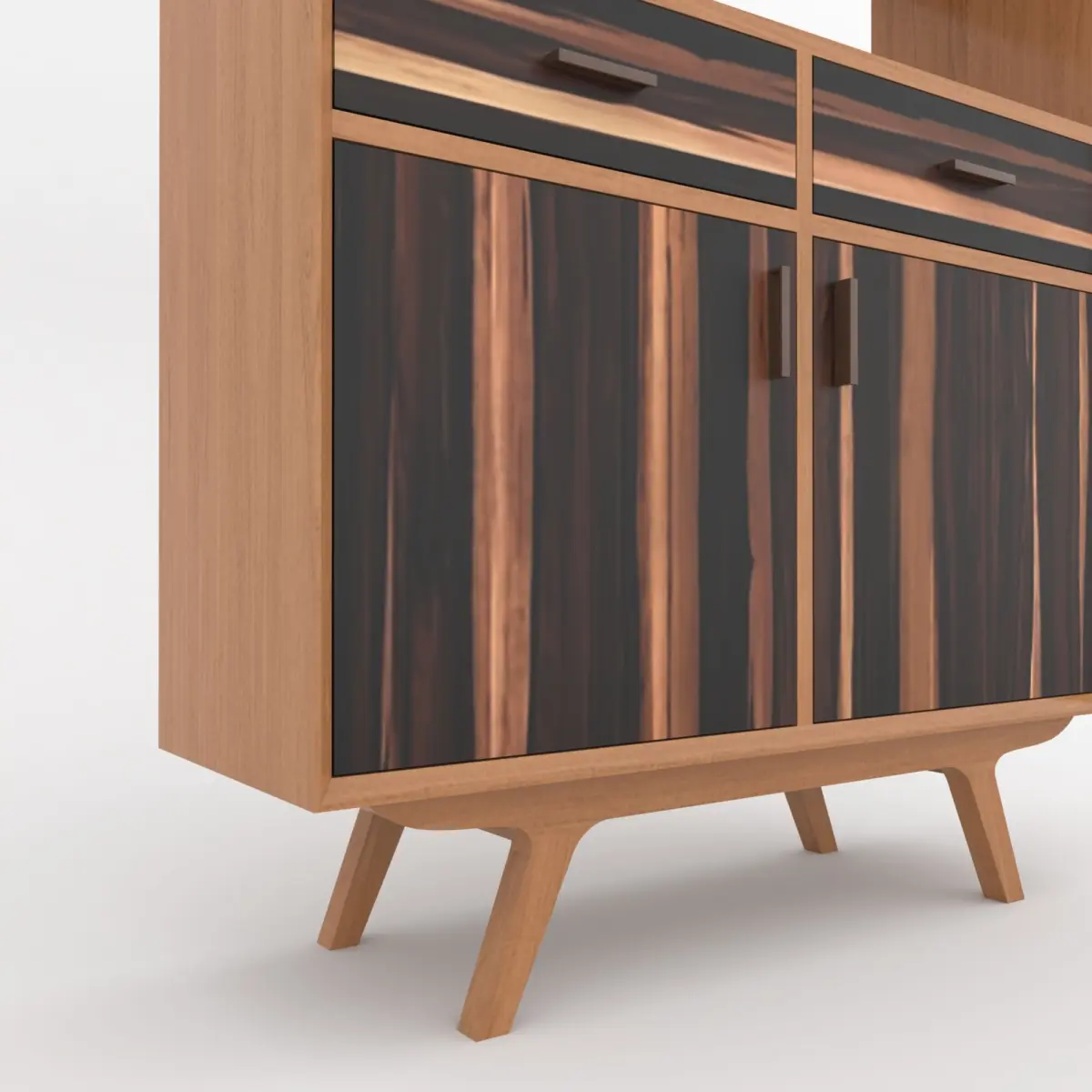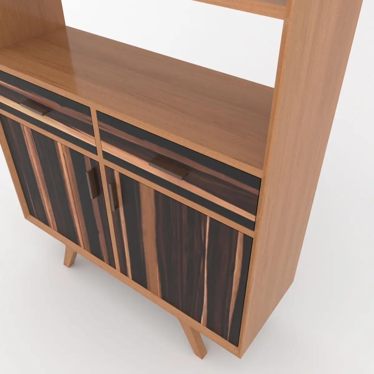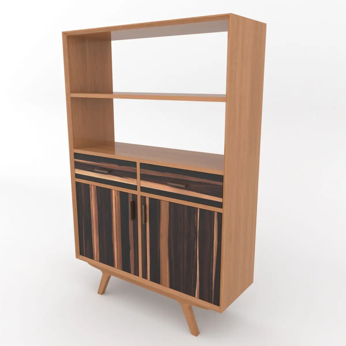 Bring timeless sophistication to your interior renders with this mid-century modern bookshelf cabinet 3D model. Designed with clean lines and elegant wood textures, this piece features a natural teakwood frame combined with striking rosewood drawer and door fronts for a bold, contemporary contrast.