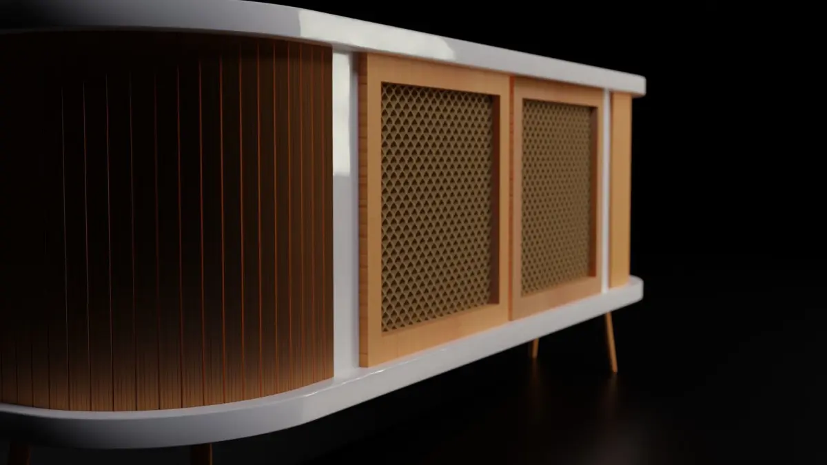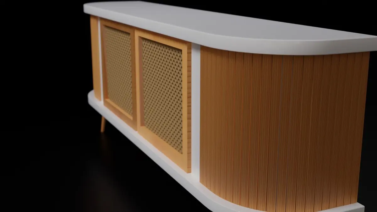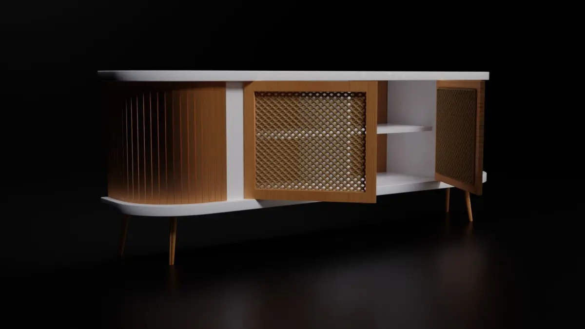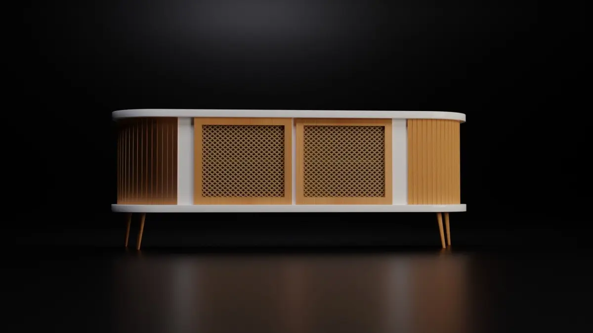 The standout feature of this Buffet Cabinet lies in its organic design, adorned with beadboard detailing, Rattan grid and supported by four tapered legs.