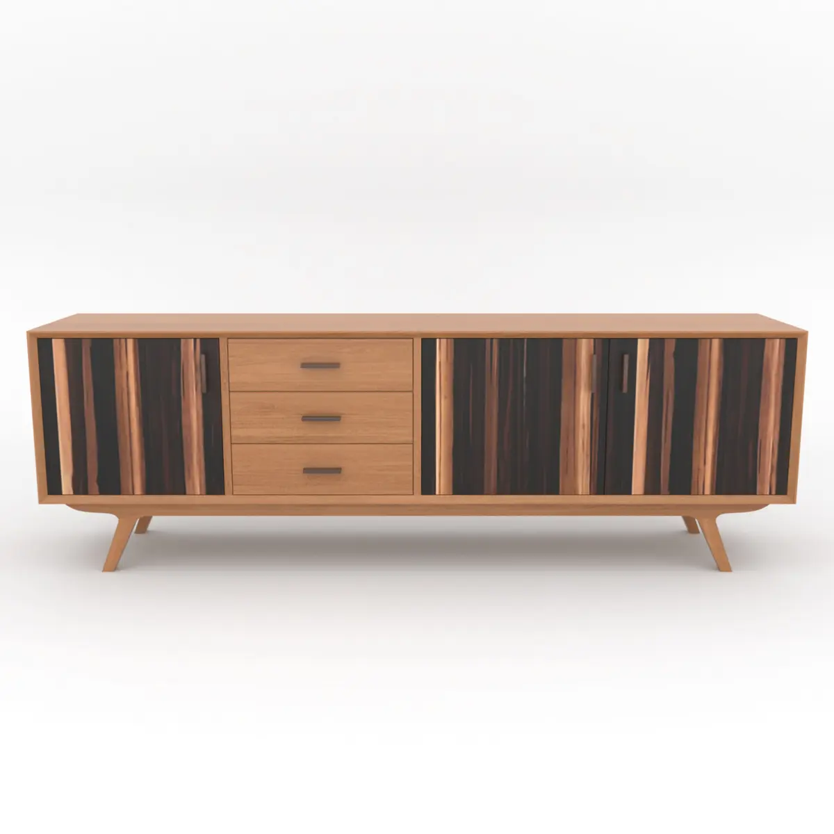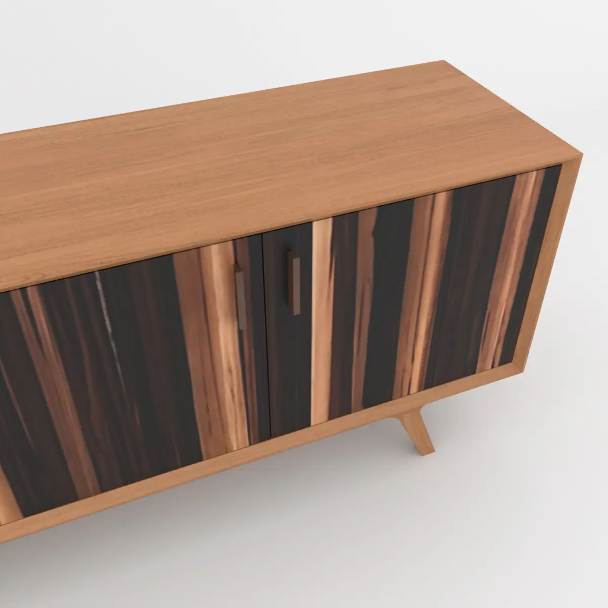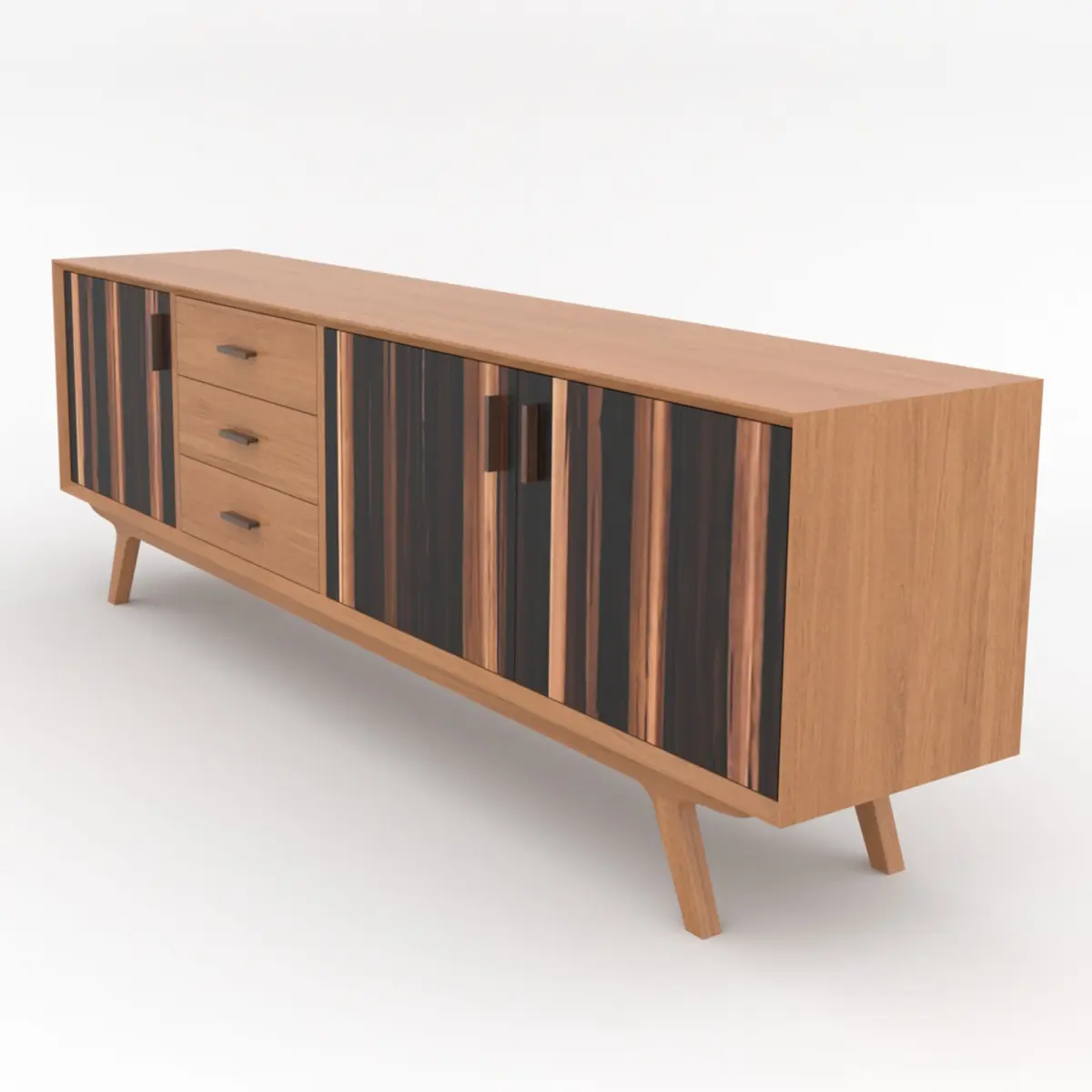 Bring timeless sophistication to your interior renders with this mid-century modern sideboard cabinet 3D model. Designed with clean lines and elegant wood textures, this piece features a natural teakwood frame combined with striking rosewood drawer and door fronts for a bold, contemporary contrast.