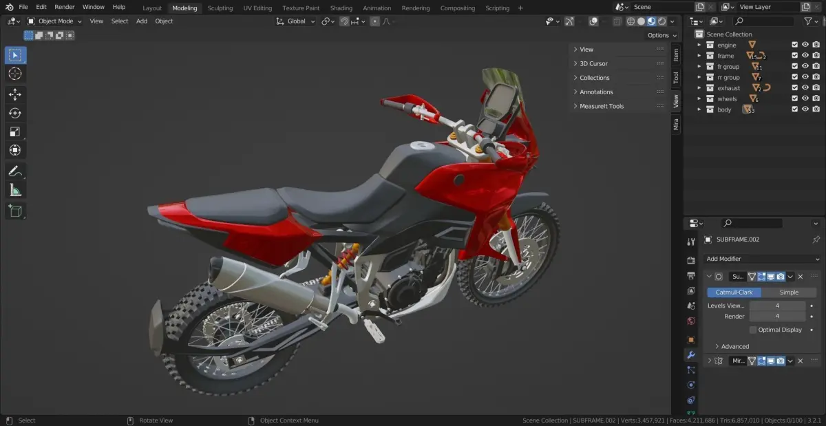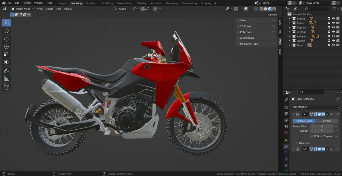 combustion engine based mid size adventure enduro, dual sport motorcyle created in blender. structured file. high detail level. materials applied . stl available (non applied modifiers in export)