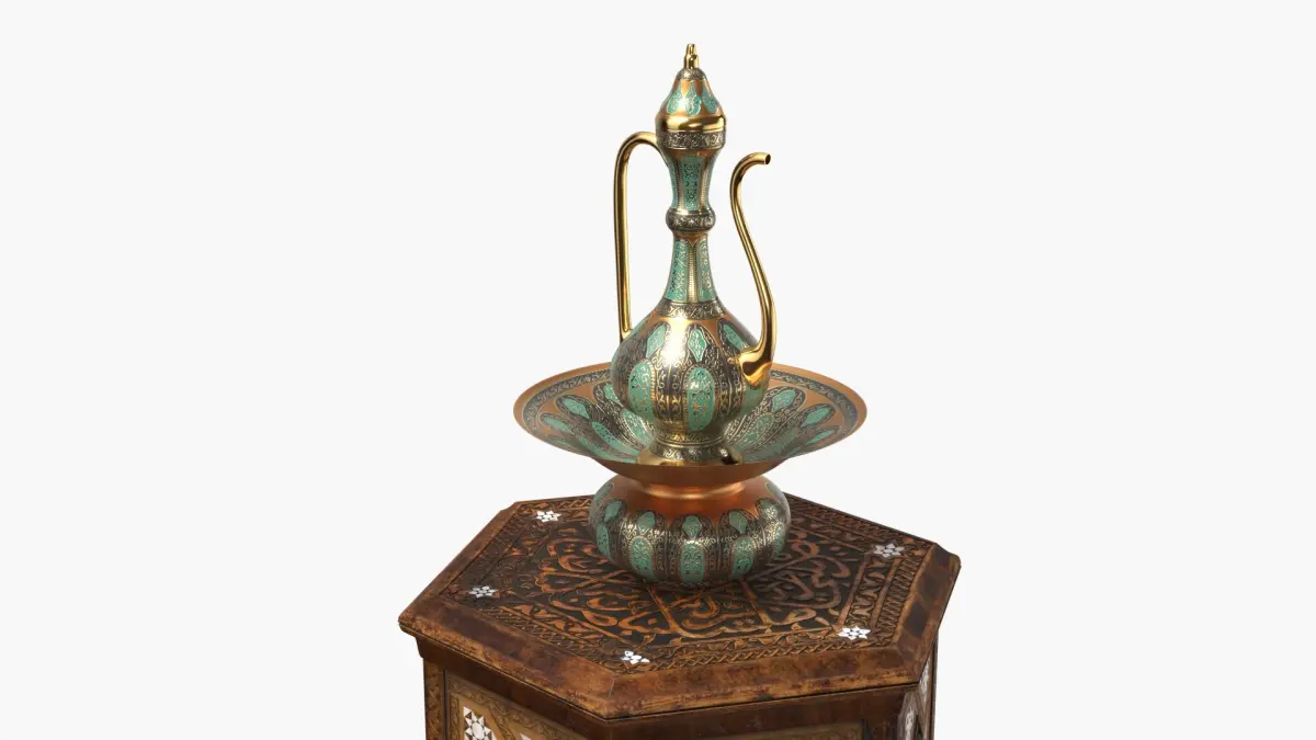Middle Eastern Pitcher Set on Hand-Carved Side Table is a three-dimensional model of intricately designed Middle Eastern water pitcher (or ewer) placed on a traditional decorative table, showcasing cultural artistry and craftsmanship.