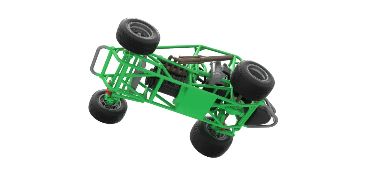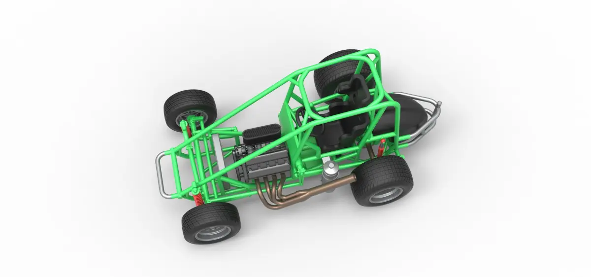 The model consists of parts: Air filter, Air intake, Body, Engine, Exhaust pipes part 1,2, Front rims, Front tires, Fuel tank, Oil tank, Radiator, Rear left tire, Rear right tire, Rear rims, Rim covers, Seat part 1,2, Steering wheel.
