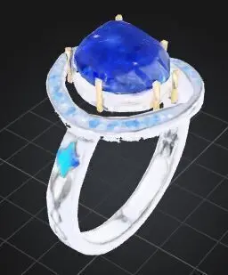 stunning high-poly 3D model of a fantasy gemstone ring inspired by the night sky. The ring features a large, deep-blue teardrop gemstone filled with tiny stars, resembling a magical galaxy. A half-moon silver halo encrusted with sparkling blue diamonds gracefully embraces the gemstone. The ring band includes delicate star engravings and an accent turquoise star on the side, enhancing the celestial theme
