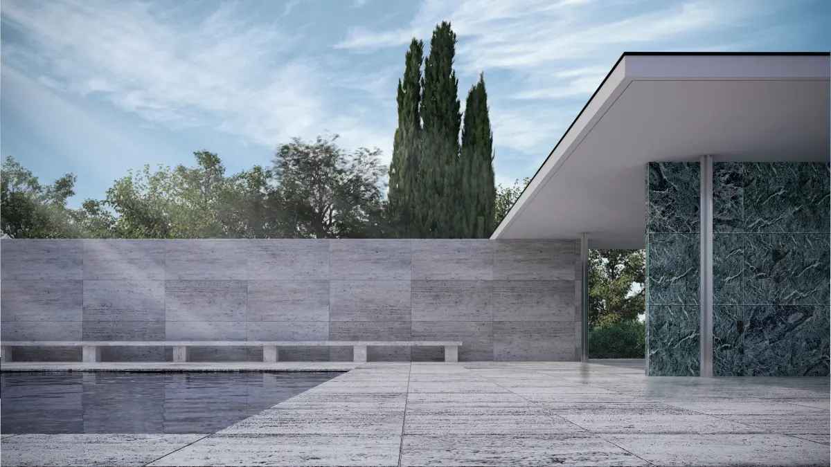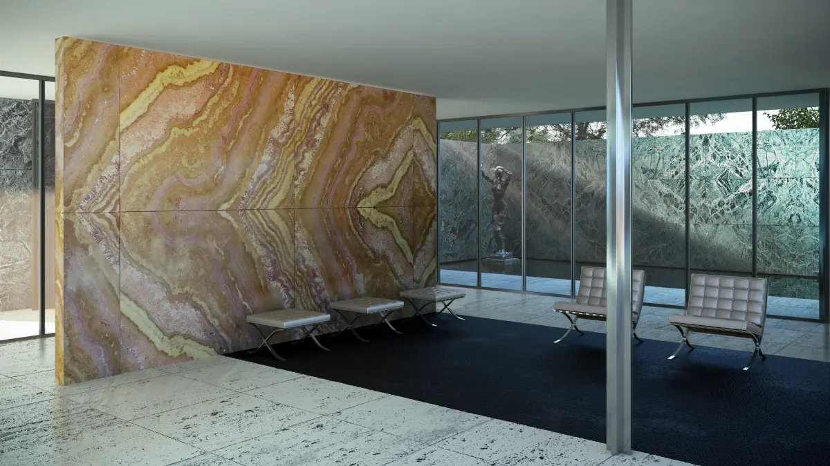 Accurate 3D model of the Barcelona Pavilion (1929 International Exposition), based on CAD file, close to the original.Created with 3dsmax 2019 and rendered with Vray Next 3.1 with gamma 2.2.