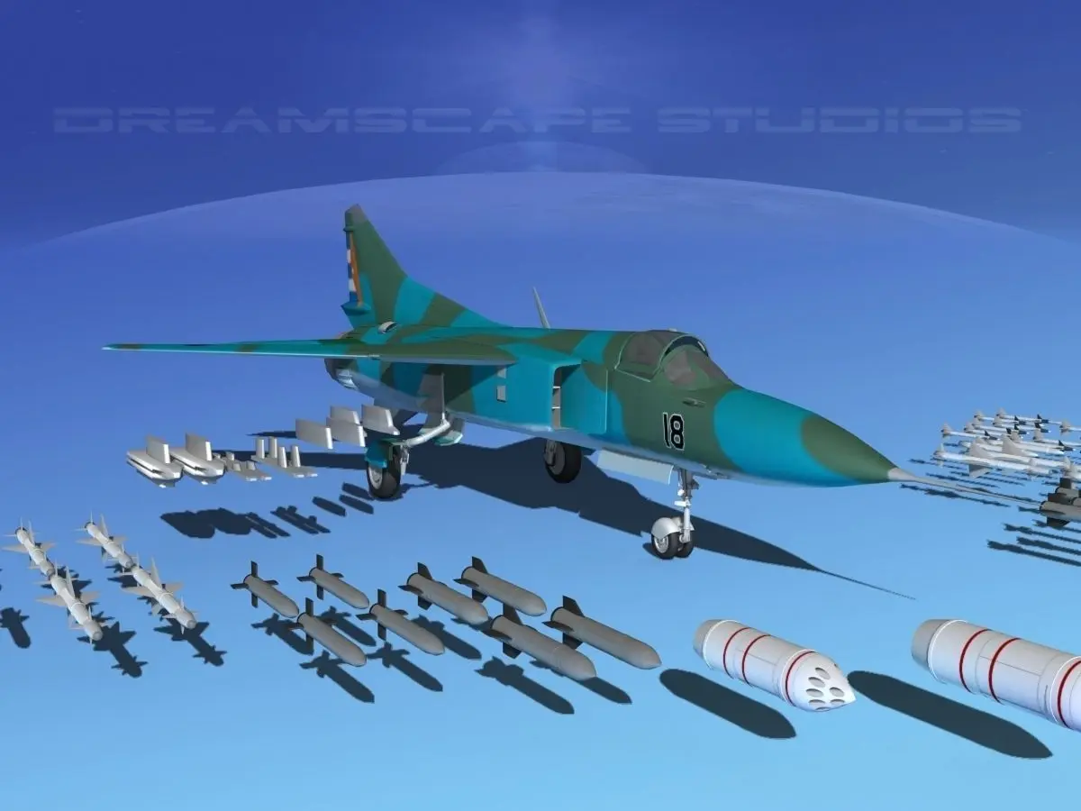 The MIG-23 Flogger B model here is a complete replacement for our earlier MIG-23 model from 2005. This model has been completely rebuilt from scratch using a vast area of resources recently acquired. It was built very near to scale, within a few inches of actual general dimensions and very detailed. It has a very detailed exterior, engine exhaust and after burner section as well as cockpit. It is fully textured including flight instruments and engine exhaust components. It has many animateable features including variable sweep or geometry wings, flaps, flaperons, stabilizers, rudder, wheels, landing gear and landing gear doors, missiles and rockets, opening canopy, throttle and stick, toggle switches and others. It has high quality maps and materials. This model is available in a wide range of formats.