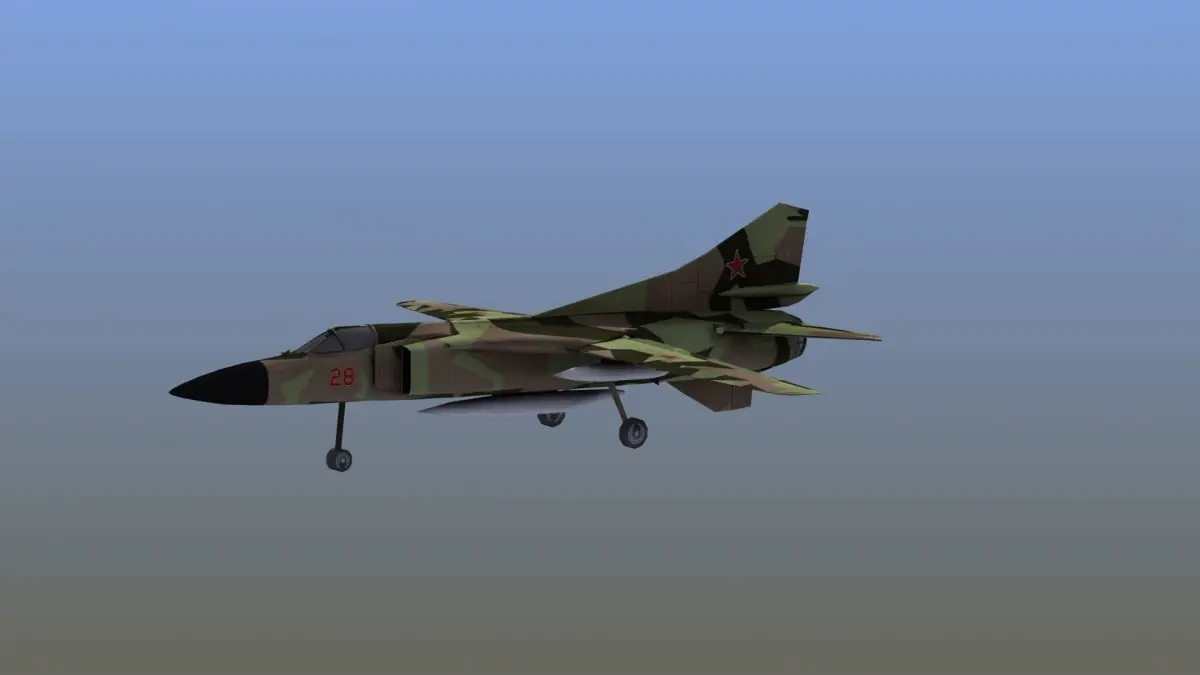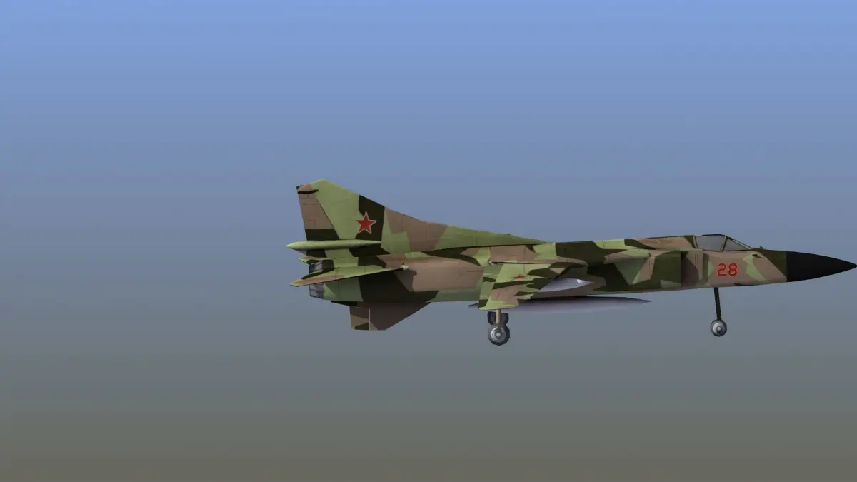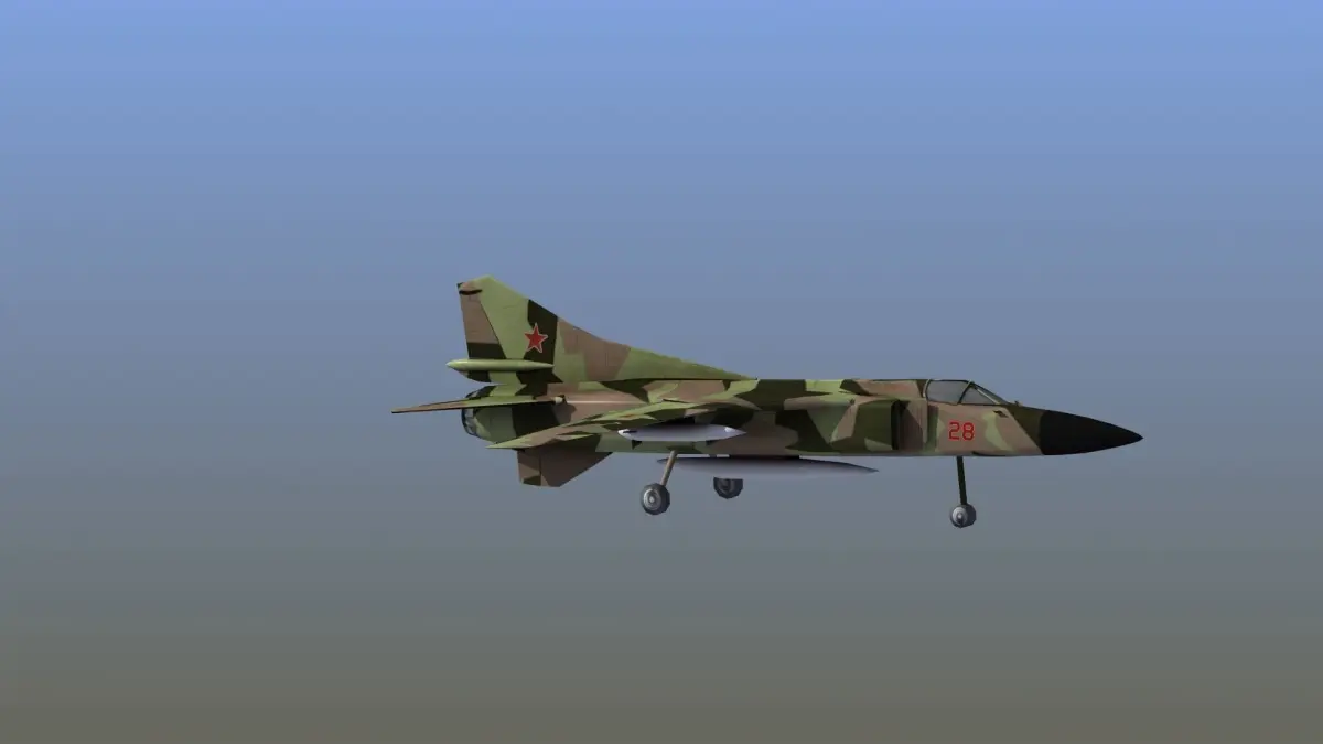 Mig-23 Flogger military jet. Great multipurpose 3D model - ideal for offline rendering or real time uses such as games or simulation. Landing gea included.