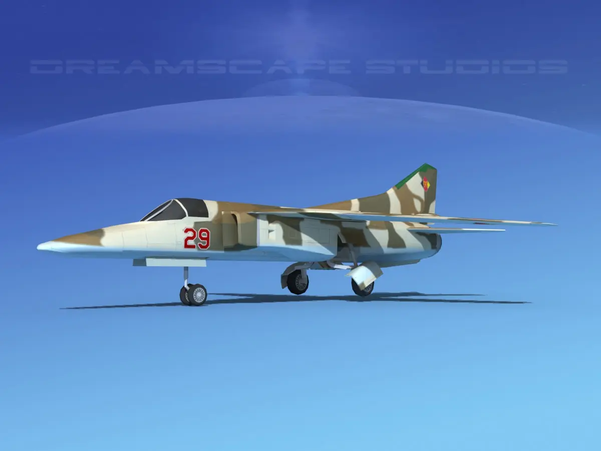 This low poly MIG-27 3d model was built near to scale in general dimensional terms. It includes landing gear and wings are in the most forward sweep position. This model has animateable flaps, slats, stabilizers and rudder. Landing gear can be rotated hidden and landing gear bay doors closed. This model comes with the materials and textures and is available in a wide range of formats.