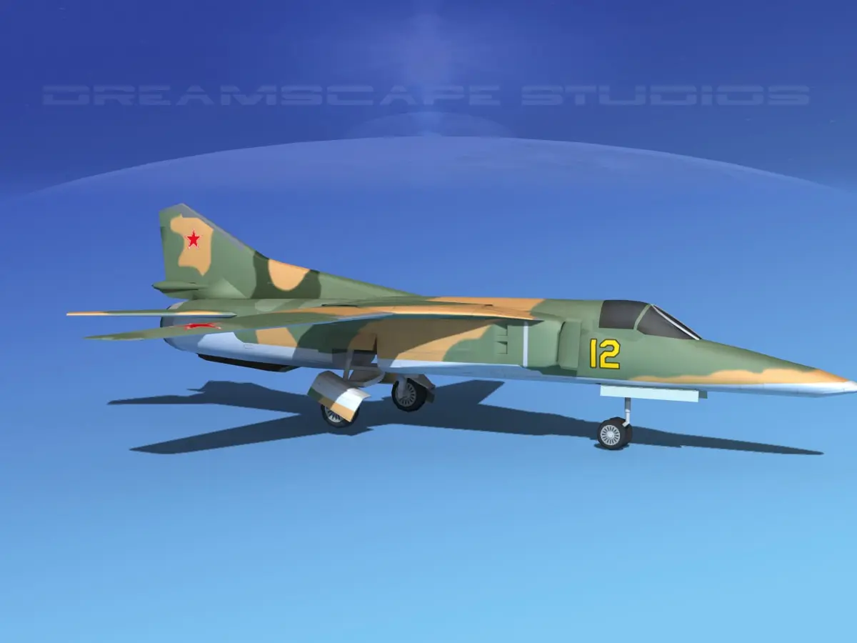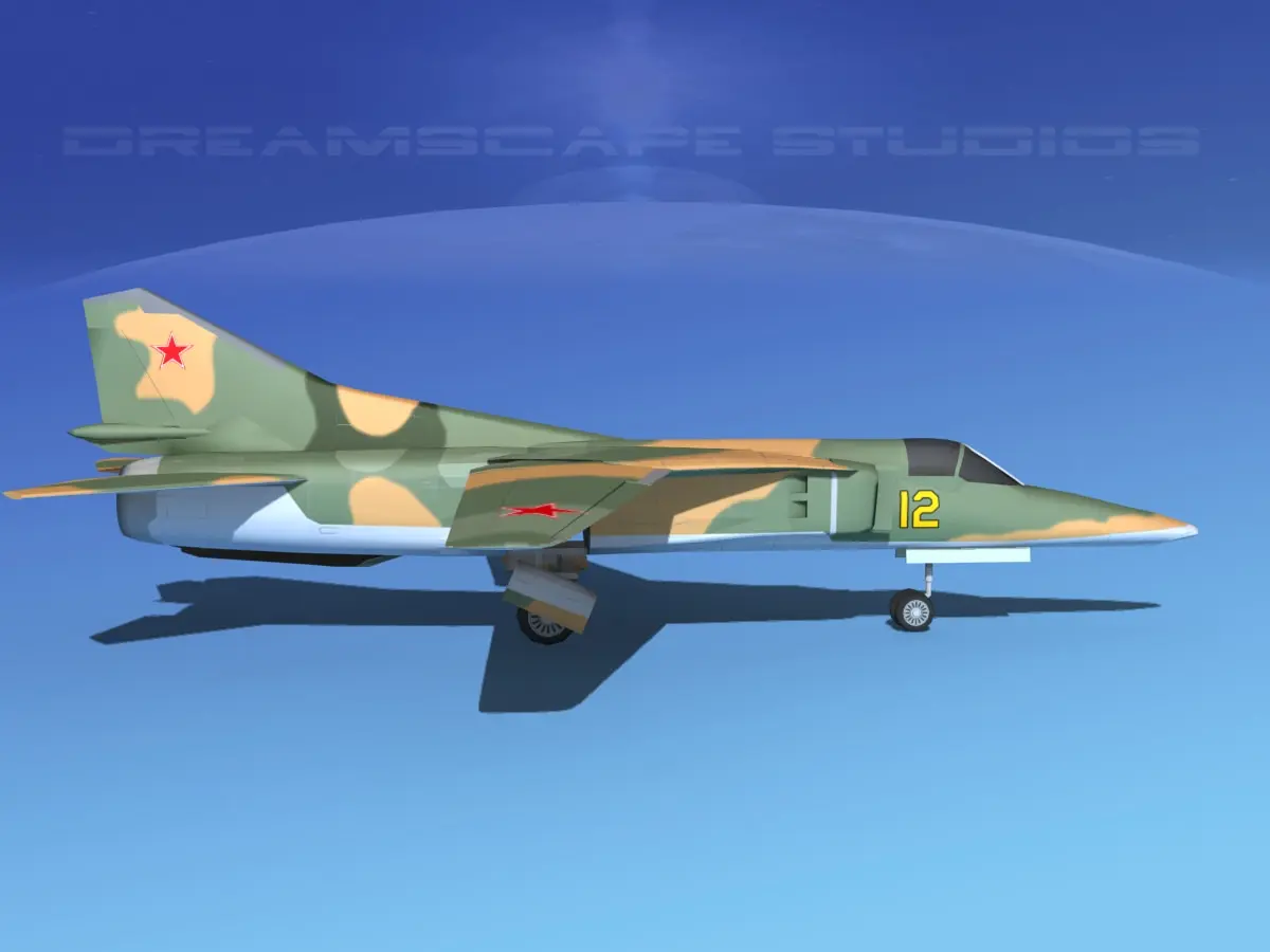This low poly MIG-27 3d model was built near to scale in general dimensional terms. It includes landing gear and wings are in the most forward sweep position. This model has animateable flaps, slats, stabilizers and rudder. Landing gear can be rotated hidden and landing gear bay doors closed. This model comes with the materials and textures and is available in a wide range of formats.